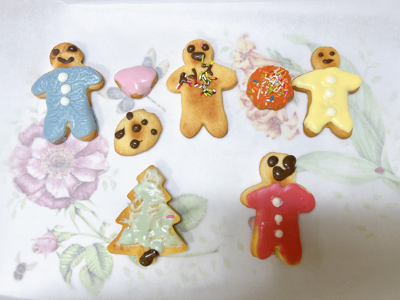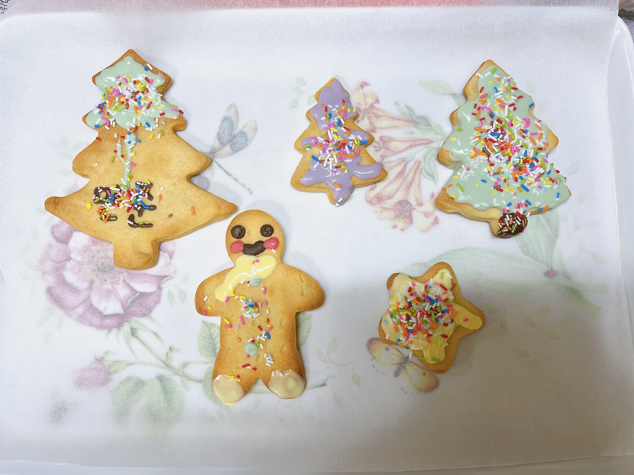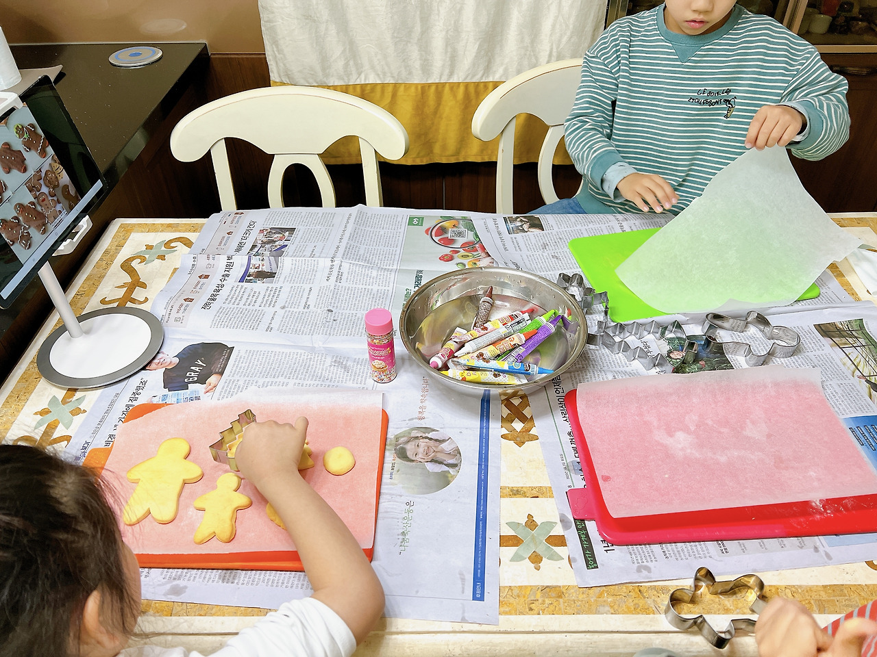 신문지를 깔고, 도마 위에 밀가루를 살짝 뿌려 반죽을 올린 후 밀대로 밀었다. 아이들은 사람모양과 나무 모양의 자르개로 반죽을 꾹꾹 눌렀다. 너도 나도 원하는 틀로 반죽을 누르겠다고 욕심을 내는 아이들이 천진했다. 모양이 흐트러지지 않게 틀에서 조심스럽게 반죽을 떼는 그들의 눈빛이 진지했다. 에어프라이어와 오븐에 반죽을 넣고 10분 동안 기다렸다. 꺼내어 뒤집은 후 다시 10분 구웠다. 그동안 색색의 초코펜을 뜨거운 물에 중탕했다.