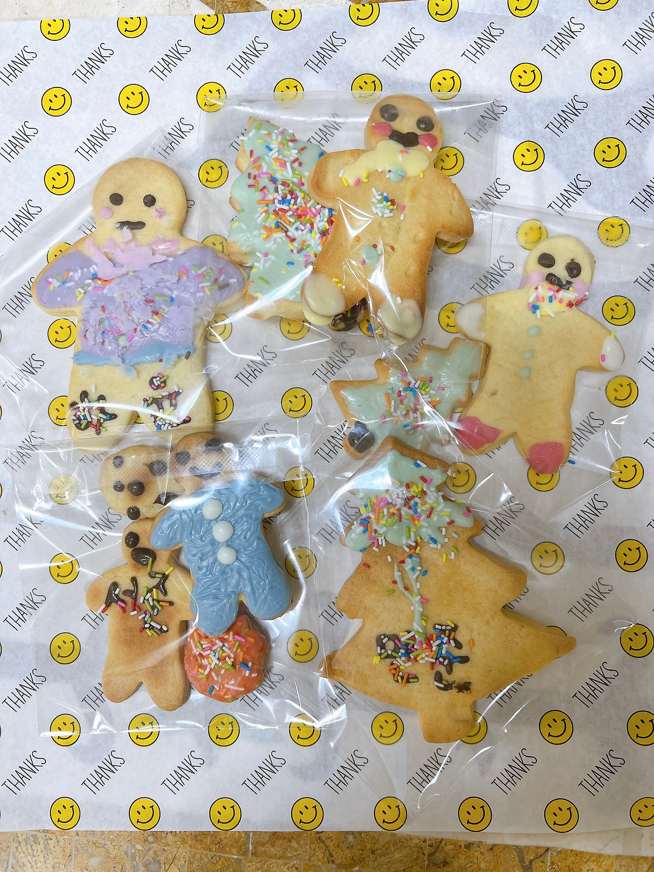 장식을 굳힌 후 그럴싸하게 포장까지 해 보더니 진짜 가게에서 파는 쿠키 같다며 신나 했다. 주말 여유로웠던 한 시간 반 동안 서로 깔깔대며 웃고 같이 머리를 맞대어 결과물을 만든 과정은 그들에게 큰 추억이 되었을 것이다. 교육자로서 다소 거창하게 생각을 해 보자면 반죽을 말랑이 만지듯 좋아하던 모습에서 촉감 자극, 쿠키가 구워지는 냄새를 맡으며 후각 자극, 장식을 눈으로 보며 시각 자극, 만든 쿠키를 맛보며 미각 자극이 되었을 것이다.