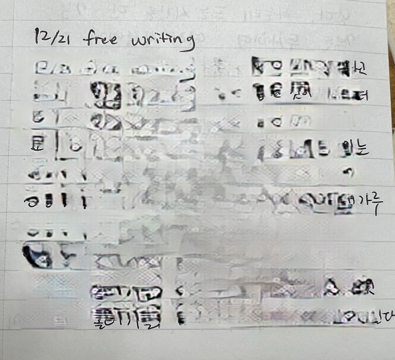 다음날 오전, 마침 브런치에 쓸 거리도 없었다. 기대 없이 새로운 시도나 해 보자는 심정으로 볼펜을 들고 수첩 맨 위에 '12/21 free writing'이라 쓴 후 핸드폰의 타이머 기능을 10분으로 맞췄다. 쓸 거리가 있을까 하고 고민했던 것이 무색하게 펜이 저절로 움직여졌다. 내가 쓴 것을 아무도 보지 않고, 쓸 시간이 정해져 있다는 사실은 확실히 편한 환경이었다. 나만 보는 것이기 때문에 문법적으로 맞지 않고 문맥이 어색해도 거리낄 것이 없었다. 이 작업이 귀찮고 고생스러워도 10분만 있으면 멈출 수 있기 때문에 인내할 수 있었다.