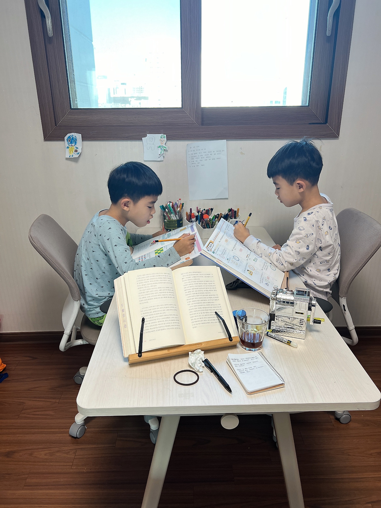 물론 쉽지 않다. 책에 몰두하려 하면 목마르다, 지우개가 없다, 다리가 간지럽다, 공부가 힘들다, 뭔 말인지 모르겠다.....아이들의 요구사항이 어찌나 많은지 한숨이 나올 지경이다. 내가 책을 보는 건지, 필사를 하긴 하는 건지 싶다. 하지만 엄마가 펜을 들고 옆에서 공부하는 행동을 보여줄 때에는 같은 말이라도 더 '먹힌다'. 노래를 부르며 수학문제를 푸는 아이에게 '강준아' 라고 낮게 읖조리기만 해도 아이는 바로 멈추고 하던 일에 집중한다. 엄마도 같이 공부하고 있기 때문이다.