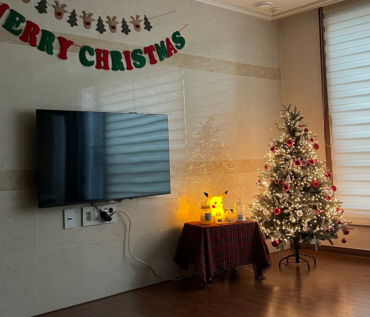 집 꾸미기의 발단은 크리스마스트리였다. 아이들이 트리를 꾸미고 싶다길래 주문한 것에서 시작되었다. 처음에 배송되어 온 트리는 눈송이를 표현한답시고 뿌려진 하얀 가루가 우수수 떨어지길래 가차 없이 반품 신청을 했다. 역시 싼 게 비지떡이라는 말을 실감하며 조금 더 비싼 트리를 주문했고, 최근 유행이지만 역시 비싼 지네전구도 같이 합배송을 시켰다. 아이들과 솔잎 가지를 벌리고, 벌린 솔잎에 빨간 색을 바탕으로 한 여러 장식들을 달고, 화룡점정으로 지네전구를 나무에 둘둘 둘렀다. 전구알은 보이지 않고 빛만 내뿜으며 반짝반짝 빛나는 트리는 특히 밤에 보면 우주의 별이 반짝이는 듯했다. 사진을 수십 장 찍고 온라인 여기저기에 게시했다.