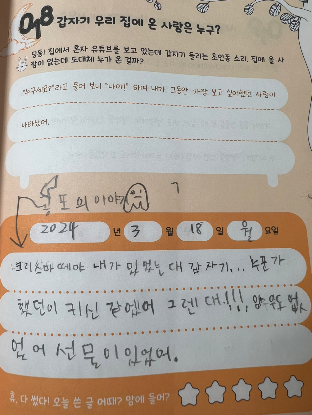 엄마의 말을 듣고 나서 끄적끄적 쓰기를 시작한다. 그러다가 또 막힌다. 그러면 이제부터 질문을 한다.