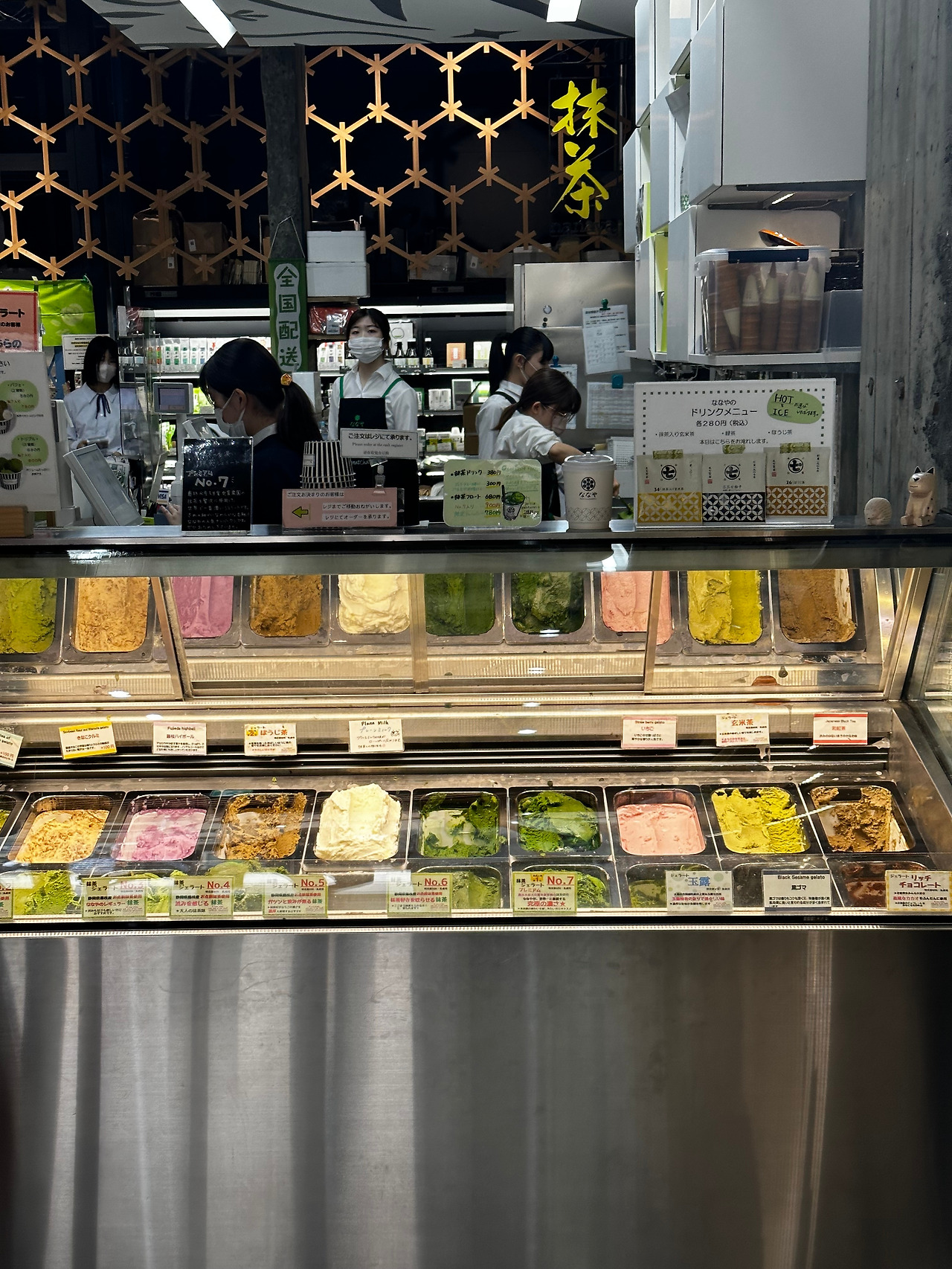 시즈오카에서는 다양한 스펙트럼의 녹차 아이스크림을 즐길 수 있다. 나나야에서는 각종 다른 아이스크림을 포함해 7가지의 녹차 아이스크림을 판매한다. 맛있다. 사실 상상 못 할 맛은 아니다. 일본식 말차를 평소에 즐겼다면 물에 타는 녹차의 양이 한 스푼, 두 스푼, 세 스푼으로 늘어나는 농도의 변화를 즐길 수 있다. 4단계와 7단계를 먹어봤는데 맛의 차이는 분명하다. 1단계는 좀 밍밍하다고 느낄 것 같다. 자신의 녹차 선호도를 분명히 알지 못한다면 3~5단계 중 하나를 추천한다. 7단계는 확실히 진하다. 그리고 아이스크림이 다소 빨리 녹는다. 녹차가 진해 옷에 묻으면 잘 지워지지 않으니 참고할 것. 콘으로 먹는다면 가게 밖으로 들고 나와 가급적 빨리 해치워야 한다. 엉덩이를 뒤로 빼고 최대한 녹아내리는 아이스크림을 옷에 묻히지 않는 것이 중요하다.