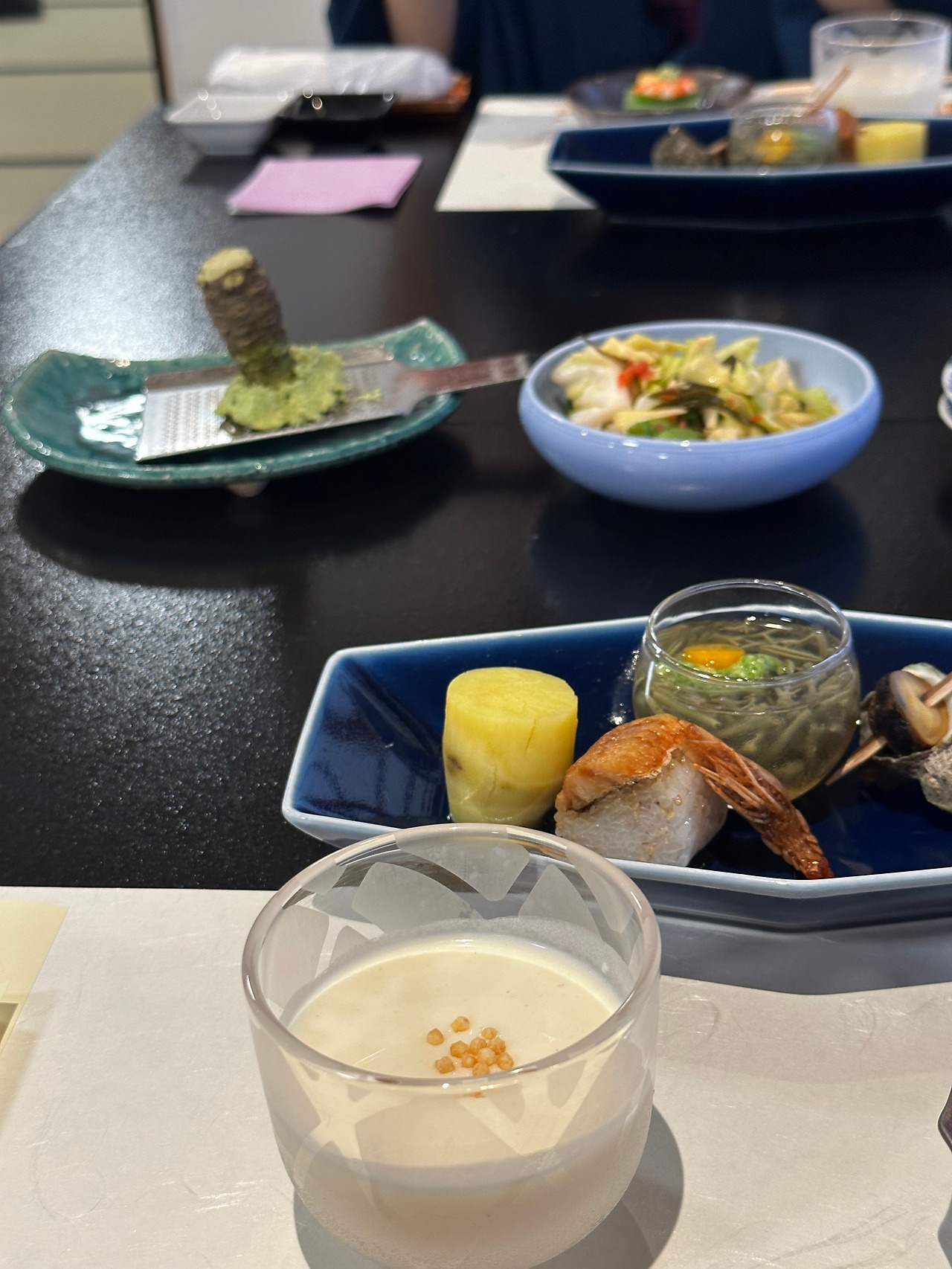 아라이 료칸에서는 숙박하는 동안 입고 다니는 유카타의 색깔을 고를 수 있다. 유카타 입는 법을 몰라 유튜브까지 검색해 봤는데 오비(허리끈) 매는 법은 여전히 아리송해서 어떻게 잘 고정시키고 밥을 먹으러 나섰다. 사전에 배정된 자리에는 와사비와 함께 애피타이저가 준비되어 있었다. 생으로 갈아먹는 와사비는 맵기도 맵지만 일반 와사비보다 훨씬 풍미 있다. 코스로 나오는 모든 음식에 일부러 와사비를 올려먹어 봤는데 대부분 어울려서 더 놀라웠다. 다 먹으면 치우고 새로 올려주는 코스 요리는 거의 모두 해산물과 채소로 구성되어 있다. 더 먹지도 덜 먹지도 않게 설계된 식사를 마친 시간은 8시가 조금 넘었고, 각종 온천을 즐기기에 아직 밤이 충분했다.
