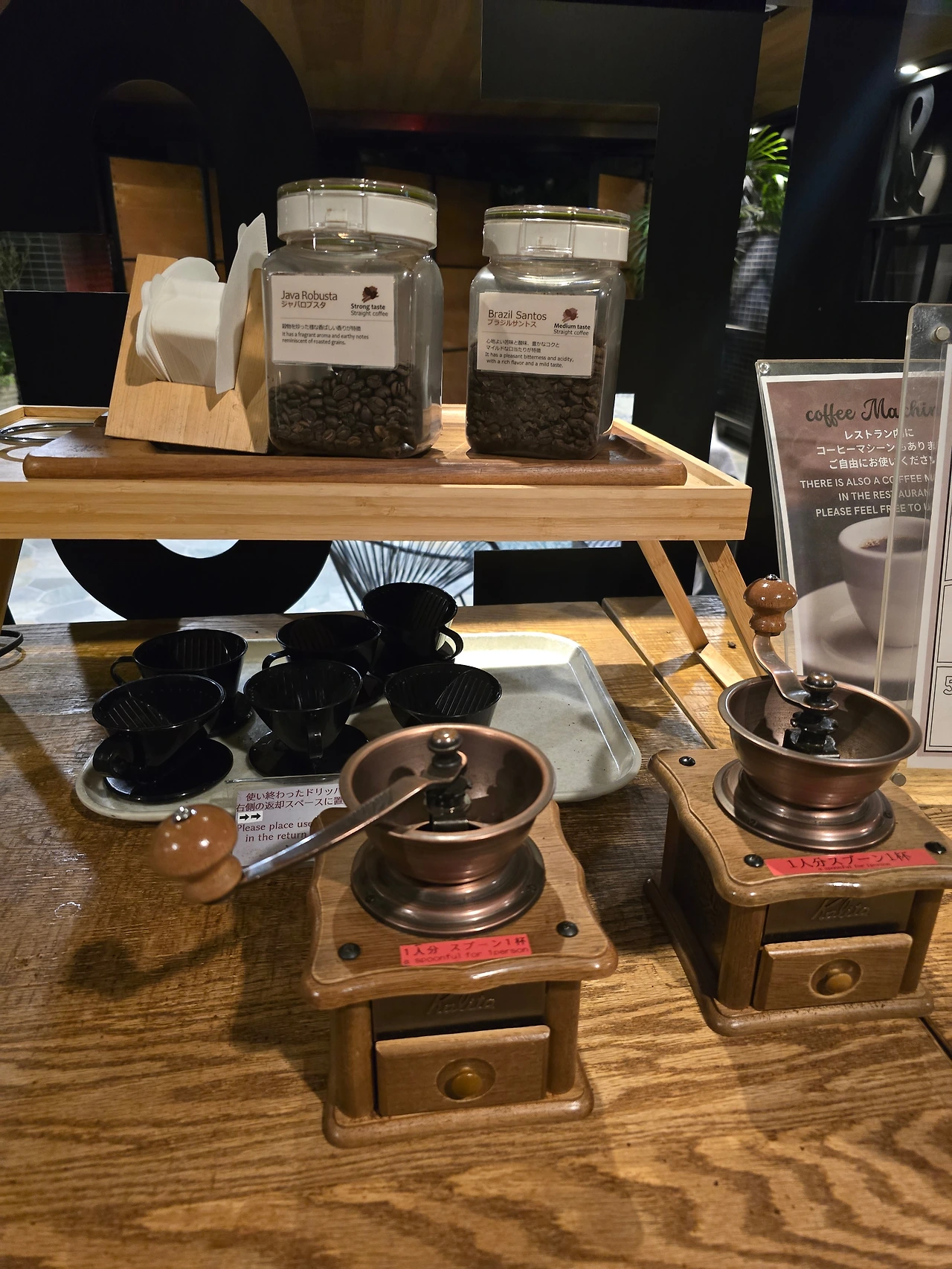동일한 공간이 아침에는 조식 식당으로 바뀐다. 야외 테이블에서 가짓수가 충분한 아침을 즐길 수 있다. 핸드드립으로 내려 마실 수 있도록 커피콩과 그라인더, 뜨거운 물, 그리고 필터도 준비되어 있다. 별관 같은 건물에 대욕탕도 마련되어 있다. 서늘한 밤공기와 함께 여행 첫날을 즐길 수 있는 호텔이다.