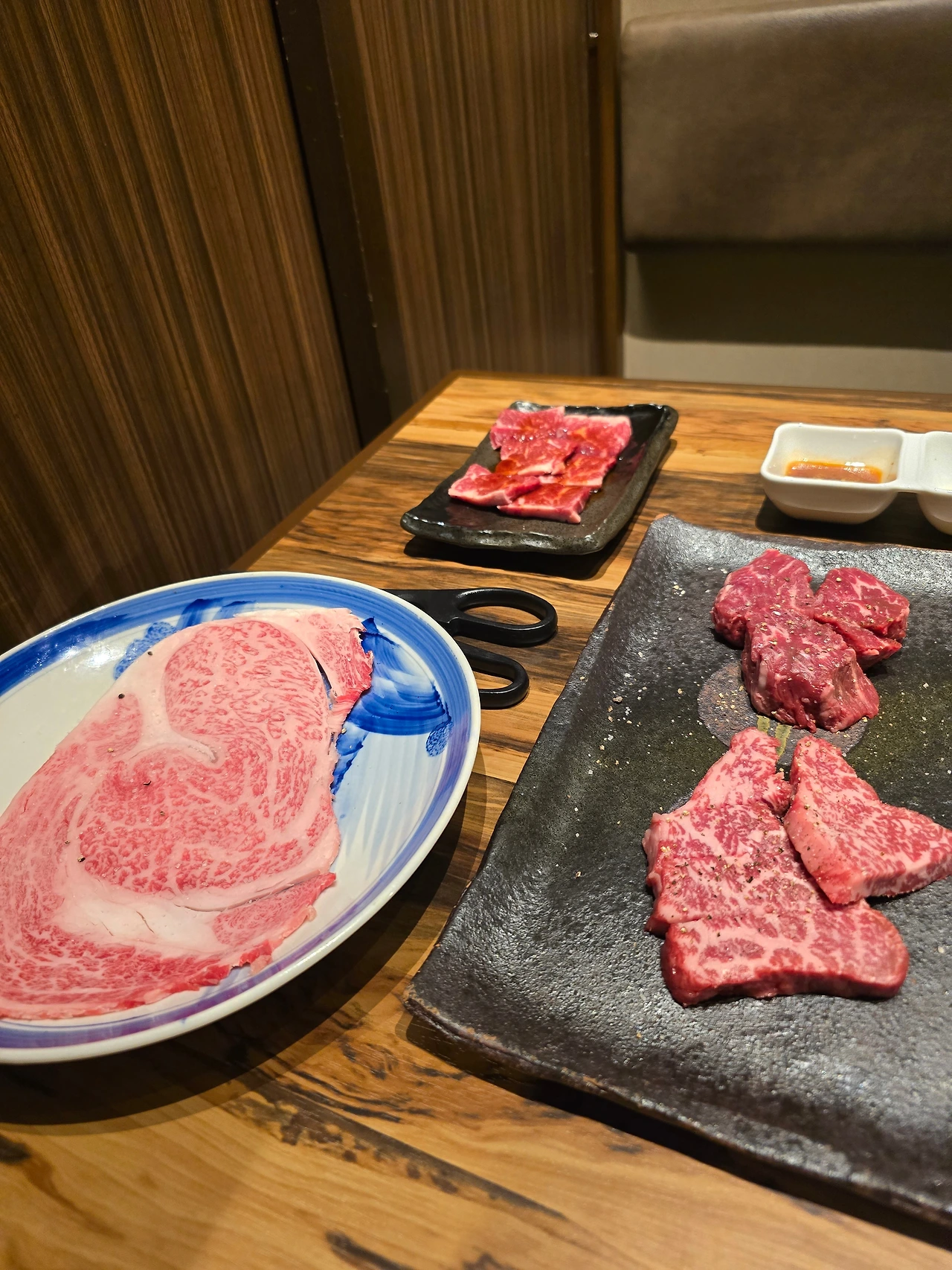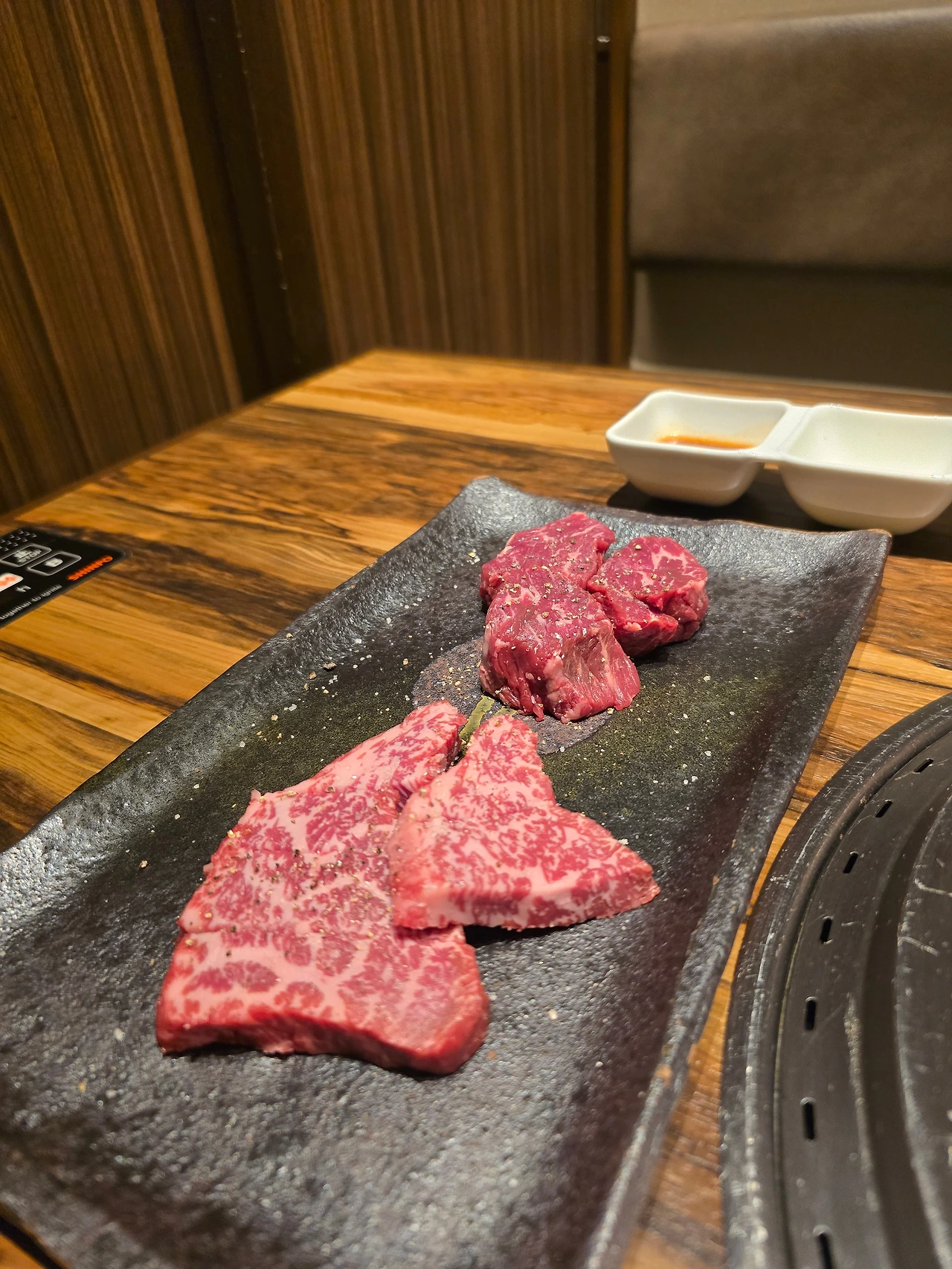 막상 메뉴를 시켜놓고 보면 붉은색 고기인 건 똑같다. 그런데 여기, 안창살이 미쳤다. 치이익 구워서 입에 넣으면 녹아 없어진다. 솜사탕을 구운 걸까. 모든 세트 메뉴에는 우설이 포함되어 있어, 거부감이 있다면 개별 부위로 시켜도 된다. 한국식을 표방하여 김치, 냉면 같은 반찬과 후식 메뉴도 있는데, 일본화되어 상에 내어주니 참고하자. '흑우'라는 사케도 판다. 곁들이면 좋지만, 특별하지는 않다. 둘이서 배불리 먹으면 10만 원 정도 쓴다.