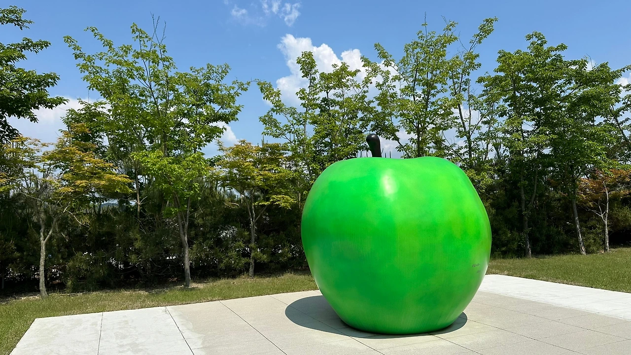 푸른 사과의 첫 번째 작품은 일본의 효고현립미술관(Hyogo Prefectural Museum of Art)에, 두 번째 작품은 나카노시마 어린이 책 숲 도서관(Nakanoshima Children’s Book Forest)에 설치되었습니다.