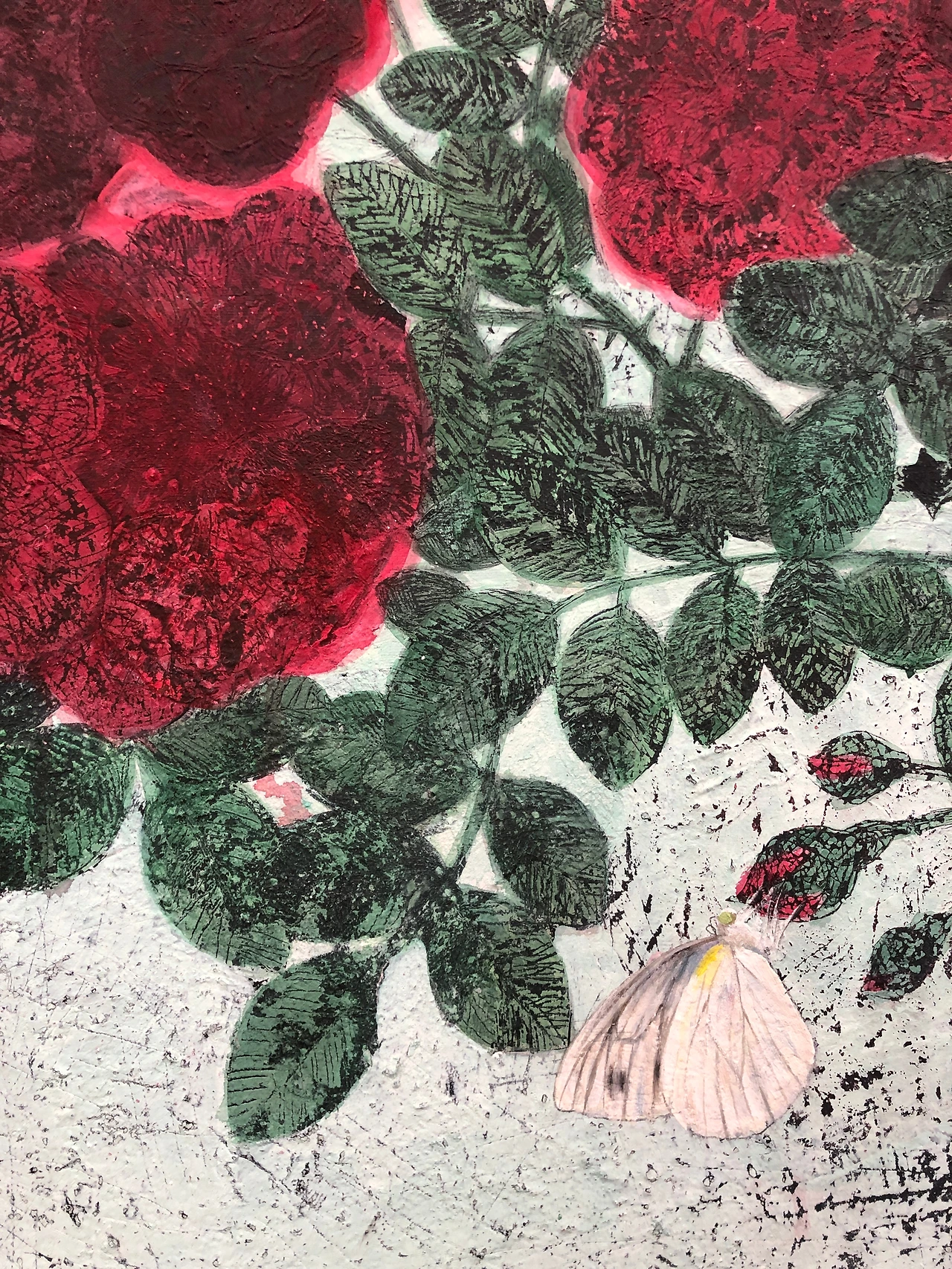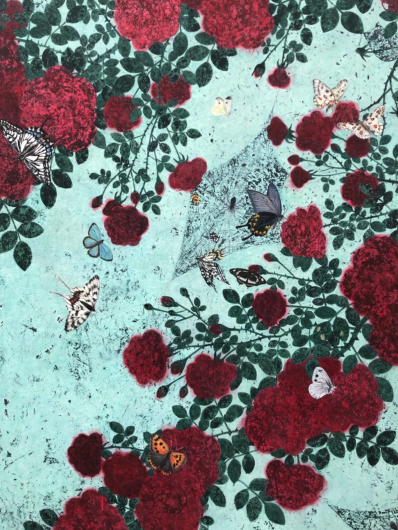 문성식 작가의 작품은 들여다볼수록 재밌는데, 그의 그림엔 현실적인 요소가 담겨있고 시간의 흐름까지 표현하고 있다. 가령 나방과 나비가 공존한다든가, 굼벵이가 기어다닌다든가.