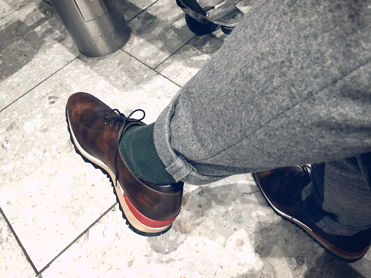 나에게도 그 쯤인가 어떤 느낌이 엄습했고, 그 때 부터 나는 클래식한 가죽구두를 지난 3년간 단 한번도 신지 않았다. 하지만 샤이니 블랙 정장구두와 거뭇거뭇하게 스톤워싱 피니싱된 화이트 스니커즈 사이의 갭이 나에게는 넓어 보였다. 그런데 우연히 나는 평소 알고지낸 밀라노 가죽공방 친구의 소개로 명품의 대명사이자, 발랄한 오렌지 컬러를 클래식한 럭셔리 컬러로 둔갑시킨 h 브랜드와 빨간 바닥의 힐로 유명한 c 브랜드의 신발을 생산하는 공장을 알게되어 마침 공장장이자 사장인 A와 이야기할 기회있었는데, 내가 구상하는 컬렉션 컨셉에 대해 이야기 하자, 그도 이미 그러한 모델을 생산한 적이 있다고 이야기를 하였다. 그래서 며칠 후 한 번 모델을 보여줄 수 있냐고 나는 물었고 흔쾌히 허락해서 그의 공장 2층의 접견실 겸 쇼룸에서 그의 신발을 보게 되었다. 컨셉은 나와 일맥상통 하다고 할 수 있었으나 좋게 말하면 지나치게 클래식했고, 나쁘게 말하면 다소 컬러와 소재가 고리타분했고, 실루엣이 투박했다. 그로 부터 며칠 후 내가 디자인을 들고 그를 다시 찾아갔다. 며칠 간 공을 드린 스케치와 그래픽이었다. 그림을 보면서 이것 저적 이야기 했고, 결국 그는 한번 그럼 만들어 보자고 했다. 그 결과 이 신발이 나오게 된 것이다. 물론 바로 그림을 보고 두어 달 오더 넣고 기다린다고, 이런 프로토타입이 나오지 않는다.