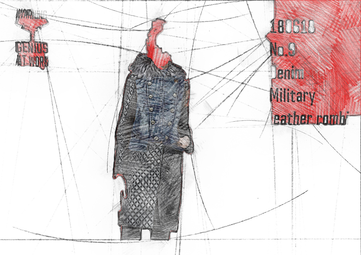 그것에 더하여, 이 콜라보의 성격상, 사전에 소재를 손에 들고, 컬렉션을 구상하지 않은 것도 그 이유가 됩니다. 소재가 미리 세팅이 되지 않은 면을 최대한 활용한 측면도 있겠습니다. 마지막 이유로서, 최후의 순간에 도식화를 패턴사에게 넘기기 직전까지, 옷에 들어갈 수 있는 잠재적 아이디어를 담을 최소한의 공간을 남겨둔 측면도 있습니다.