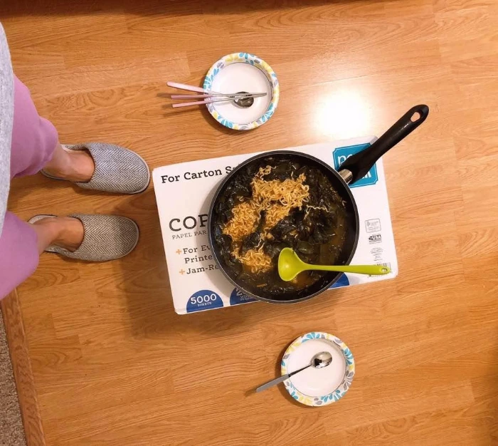 테이블도 없어 A4용지 박스에 팬을 올리고 아침 6시 부터 둘이 후루룩 라면을 먹다가 웃음이 났다.