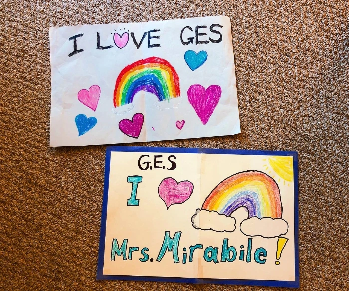 저마다 직접 그린 무지개 피켓까지 들고 있었다. <I LOVE GES> <I ♡ Mrs.Mirabile!> 이게 다 뭐야? 학교 선생님이 차타고 퍼레이드를 온단다. 코로나로 오랜시간 학교에 못나오는 아이들을 위해 선생님들이 직접 방문순회를 다닌다고. 맙소사 너무 깜찍한 발상이야!