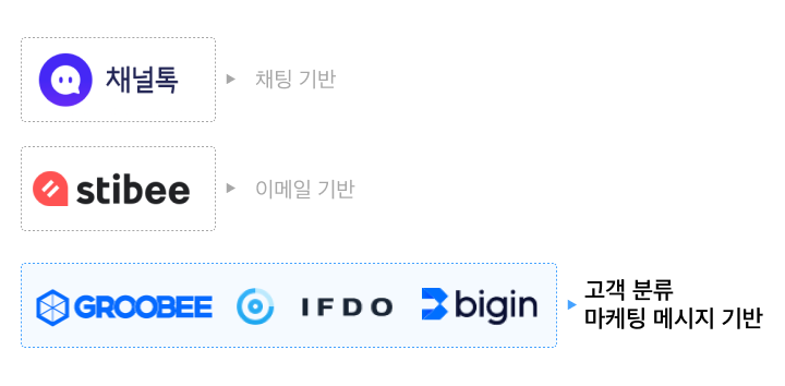 현재 국내에서 많이 사용되는 마케팅 자동화 서비스로는 그루비, 빅인, 이프두, 채널톡, 스티비가 있다. 모두 고객 분류와 개인화 마케팅을 중심으로 하지만 자세히 보면 결이 살짝씩 다르다. 채널톡은 채팅, 스티비는 이메일 그리고 그루비, 빅인, 이프두는 마케팅 메시지가 중심이다. (물론 채널톡은 최근 마케팅 기능을 추가하며 기능을 확대하고 있다.)