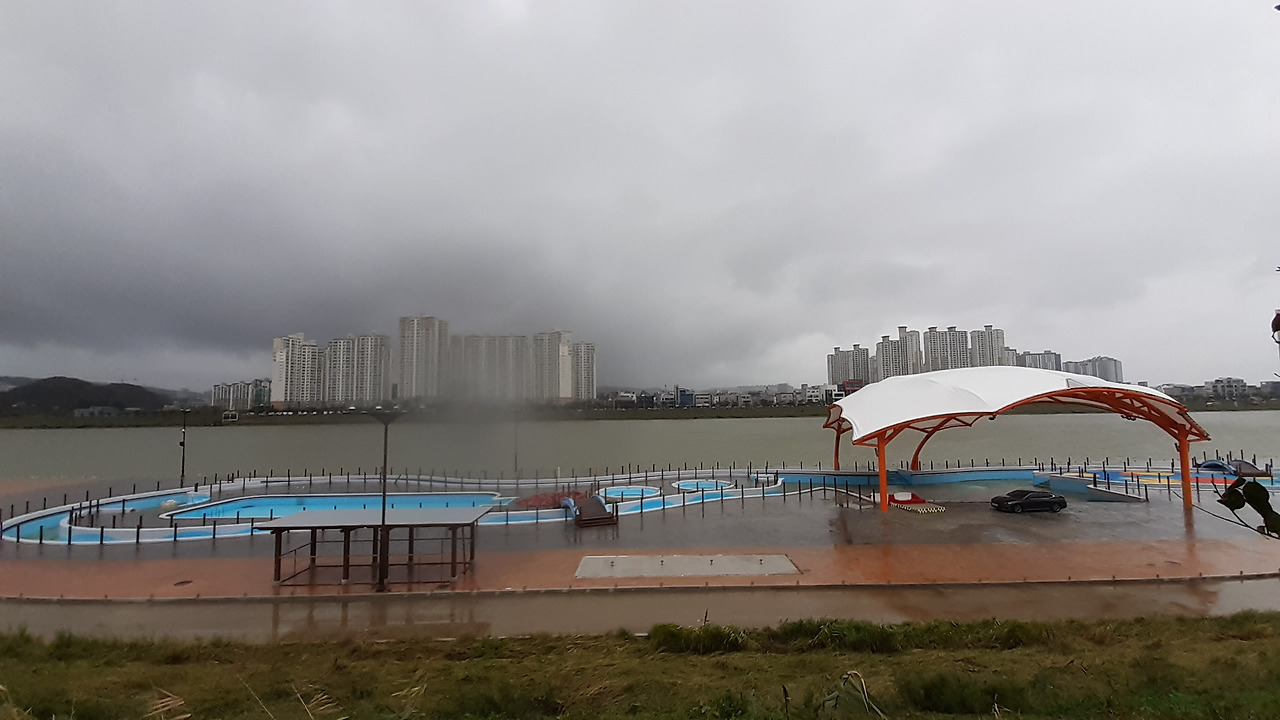 오늘 오전 장을 보고 오다가 강변에 차를 세우고 잠시 비오는 풍경을 즐겼다. 실외수영장은 한 번도 문을 열지 못하고 여름을 보냈다.