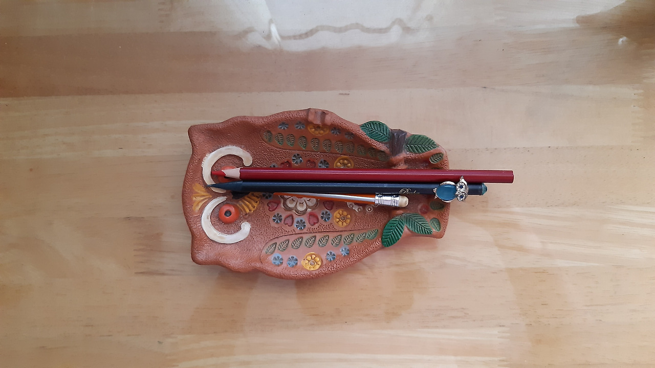 끝에 부엉이가 달린 연필은 체코 프라하의 중앙광장 작은 가게에서 샀다. 부엉이 접시는 스페인의 살라망가 가는 길 가의 가게에서 일행이 화장실 볼일 보러간 막간을 이용해서 산 것이고 책장의 부엉이는 방콕의 재래시장에서, 프린터기에 얌전히 올라앉아 있는 부엉이는 소리가 아름다운 종이다. 스페인의 톨레도에서 샀다. 알라딘 램프는 램프속 거인 지니의 도움을 받아서라도 글을 좀더 잘 썼으면 하는 소망을 가지고 아르메니아의 실크로드 거상들의 옛 숙소 앞 작은 가게에서 산 것이다. 유럽의 오래뇐 성당의 스테인드글라스 창문처럼 흙으로 구워서 예쁜 유리조각을 붙여 만든 접시는 알람브라 궁전을 보러 그라나다로 가던 길 가의 작은 상점에서 샀다. 책상 옆에 두고 열쇠접시로 쓰고 있어서 자주 들여다보곤 한다. 발이 묶인 요즈음, 작은 물건 하나로 마음껏 시간여행을 떠난다.