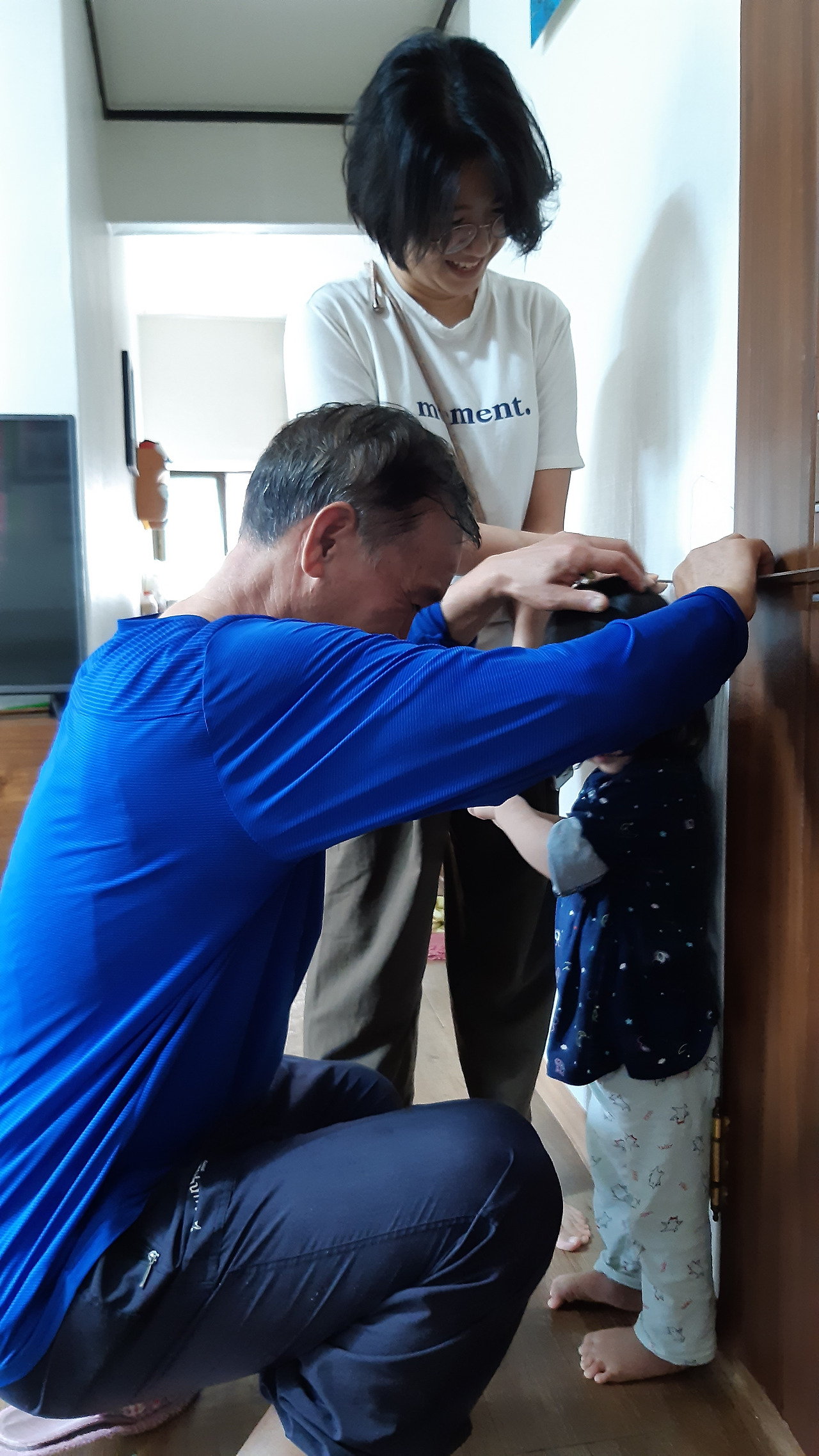 손녀는 오자마자 할아버지에게 붙들려서 키를 재고 있다.