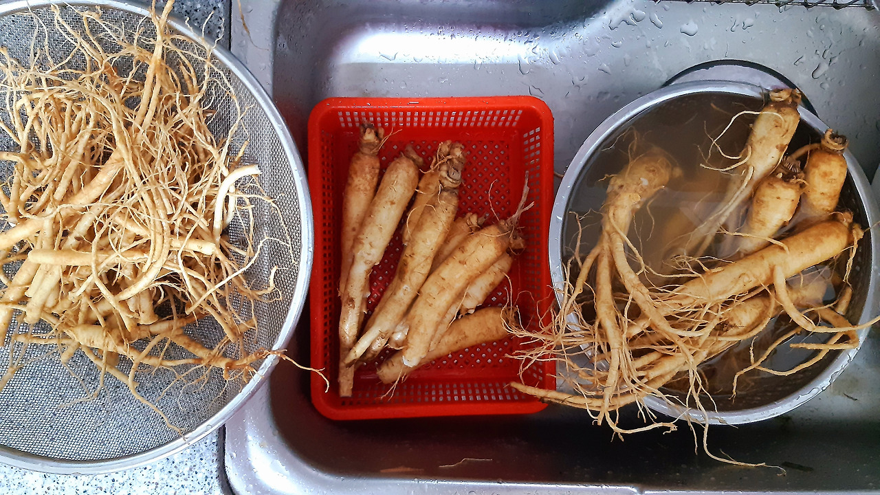 선물로 들어온 인삼도 잔뿌리는 잘라서 꿀에 재우고 굵은 뿌리는 역시 편을 떠서 말릴 참이다. 이렇게 한 번에 말려놓고 삼계탕 끓일 때 아낌없이 넣는다.