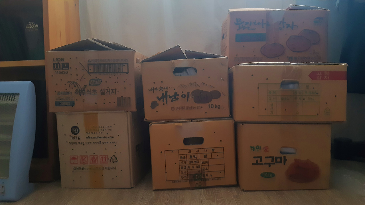 밭에서 세 번에 걸쳐 캐온 고구마를 선별해 박스에 넣어서 방에 들여놓았다. 올해 과일 채소값이 만만찮은데 고구마도 값이 비싸단다. 겨우내 간식으로 먹으면 되겠다. 마트에 갈 때마다 만원 단위로 포장해놓은 고구마를 들었다놨다 했는데 당분간 그 저울질은 안해도 되겠다.