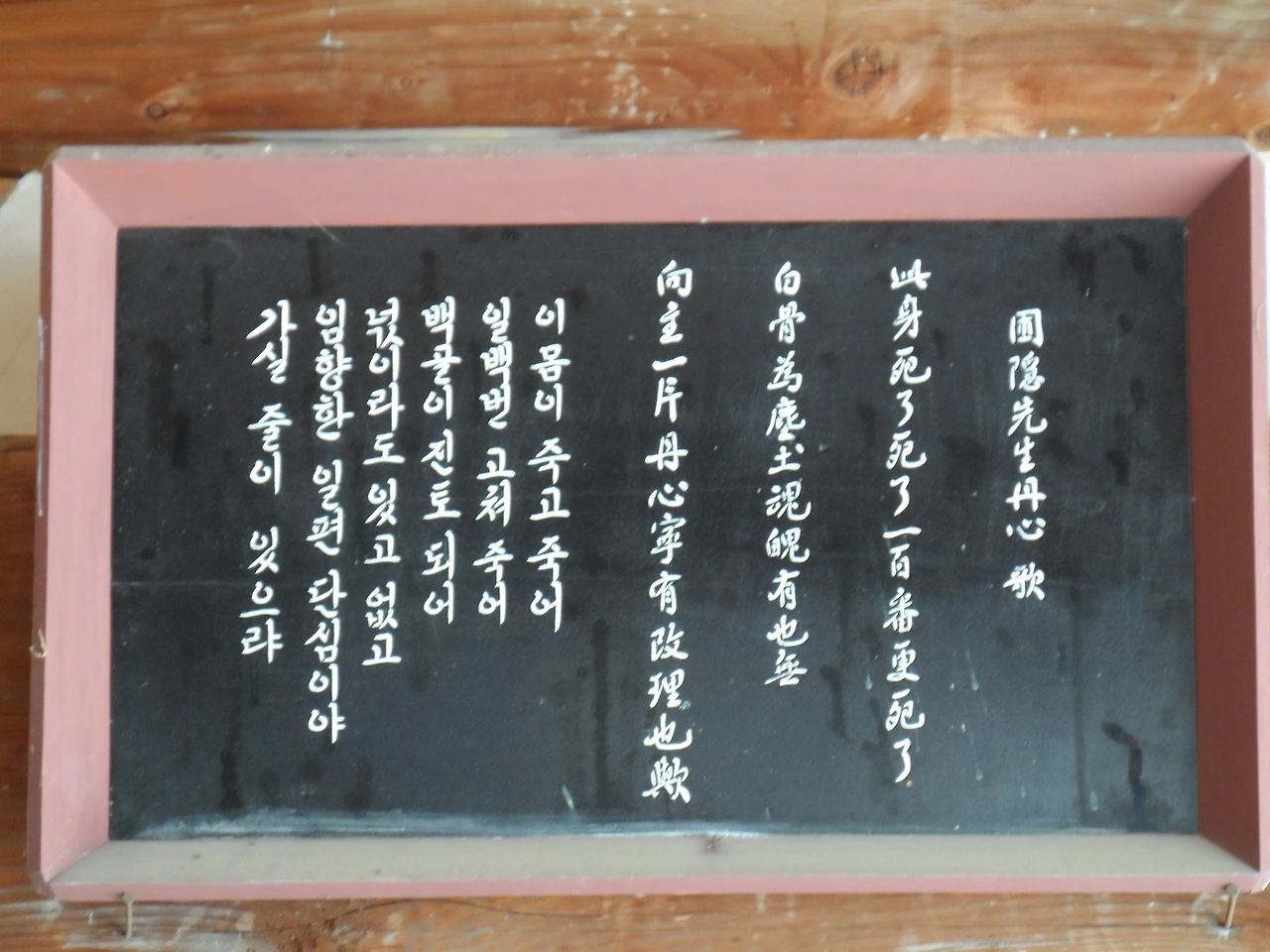 문득 고개를 들어보니 그 유명한 단심가 편액이 걸려있다. 목숨과 바꾼 신념은 시대이념을 정립하여 조선사회로 나아가는 방향을 잡아주었다. 포은 선생의 숭고한 뜻이, 대쪽 같은 절개가 당시에는 환영받지 못하였지만 유구한 세월을 건너온 지금에 이르러 더욱 높임을 받는 것은 역사의 아이러니일까?