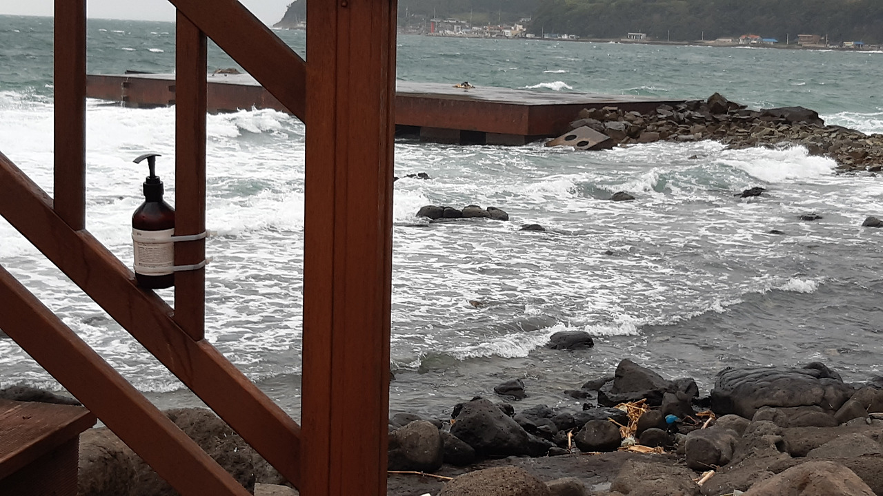 코로나 시대, 세계 최강의 K-방역을 여기에서도 보았다. 바다쪽의 데크 전망대 기둥에 달아놓은 손세정제다. 나라에 대한 자부심을 느낀다.