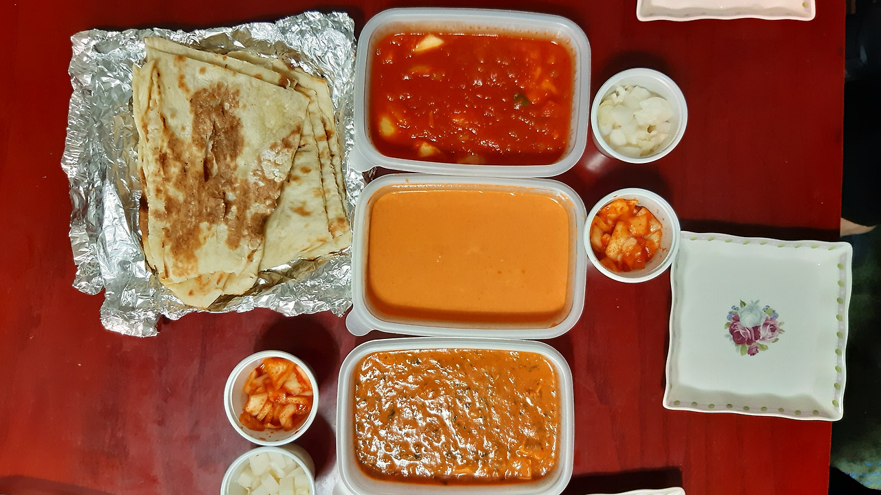 그래서 요즘은 다소 헐렁하게 하려고 애쓴다. 어제 저녁은 소고기찌개, 오늘 아침은 미역국을 먹였다. 점심 메뉴를 물었더니 며느리가 쏼라쏼라 얘길 한다. 뭐냐니까 중동음식이란다. 내가 할 수 있는 메뉴를 찾다가 내가 먹어본 인도 음식으로 합의를 보았다. 며느리가 편하게 하자고 해서 근처 인도 음식 전문점에서 포장을 해 왔다.