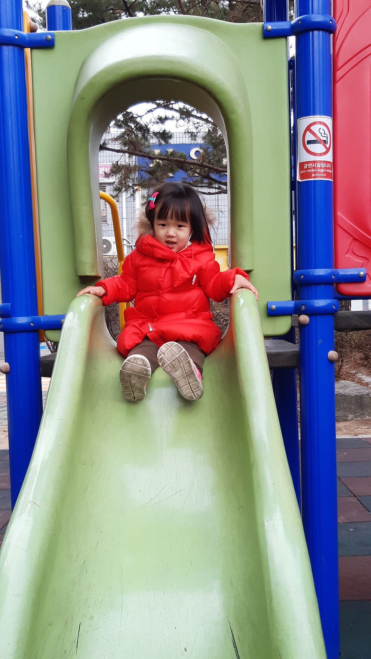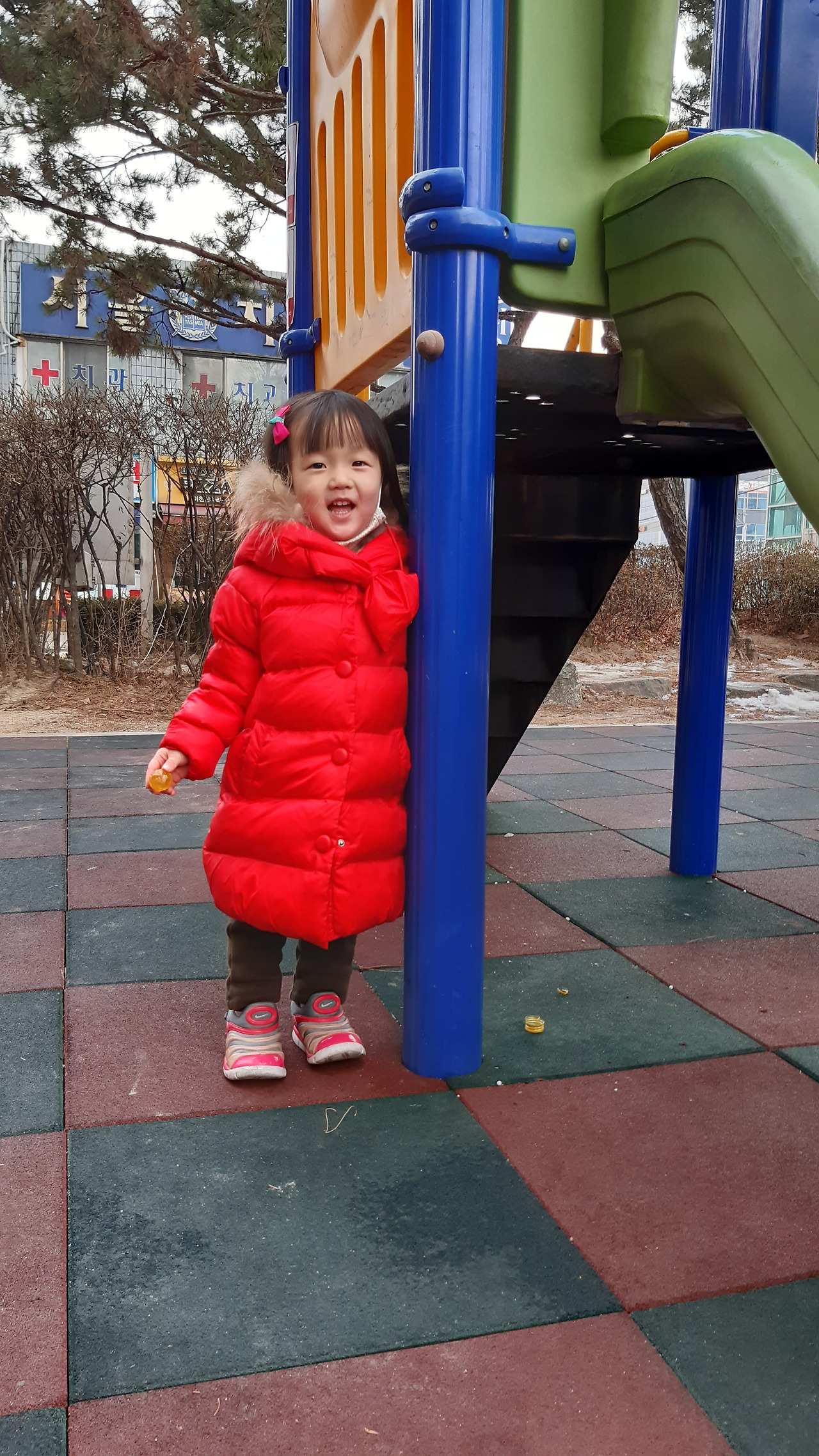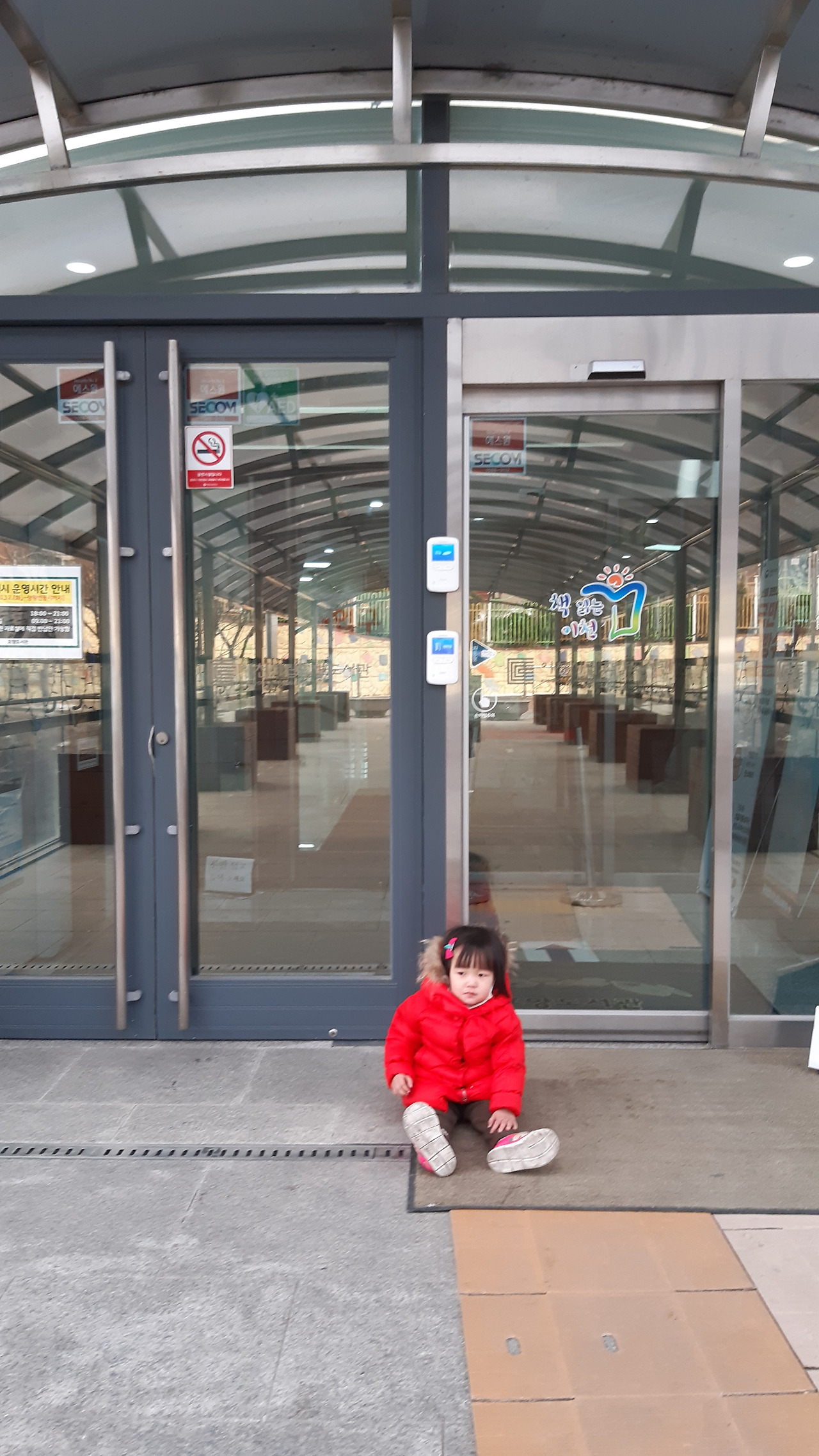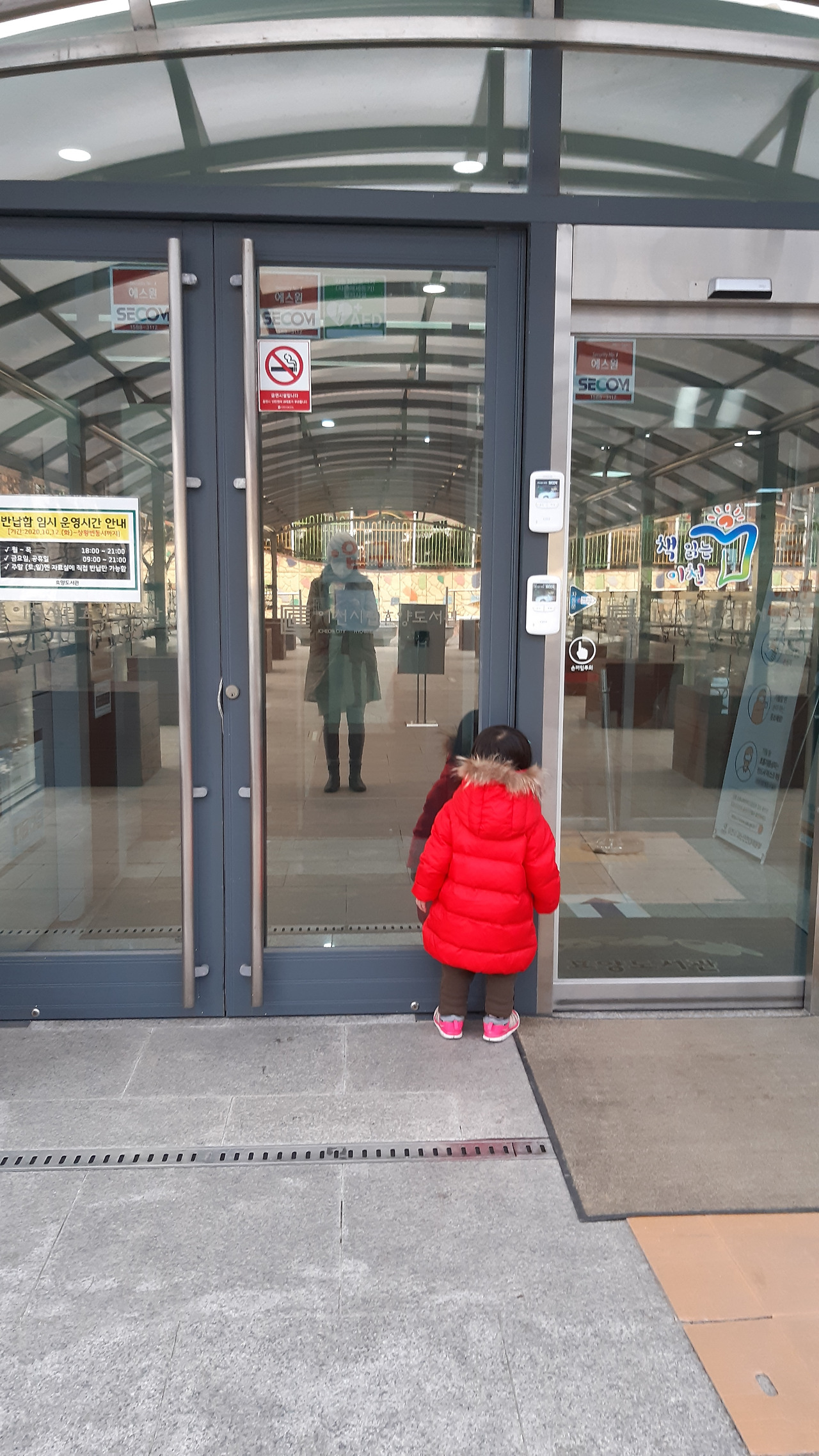 내가 가끔 들리는 커피집 데크에서 달리기를 하며 잠시 논다. 이어 이웃 동네 아파트 놀이터. 아무도 없어서 마스크를 벗겨준다. 미끄럼 타기, 그네 타기, 숨바꼭질. 띠동갑 친구 둘이서 잘 논다. 또 길을 나서서 이번엔 육교를 건너서 도서관으로 가는 여정이다. 지난 여름에 가고 처음이다. 제 엄마가 데리고 가 버릇해서 그런지 손녀는 도서관에 가는 것을 좋아한다. 그런데 오늘은 휴관일이다. 애타게 문이 열리기를 기다리길래 돌려 세웠더니 아예 바닥에 주저앉았다. 근처 눈이 녹지 않은 곳에 데리고 가서 눈장난을 하며 놀았다.