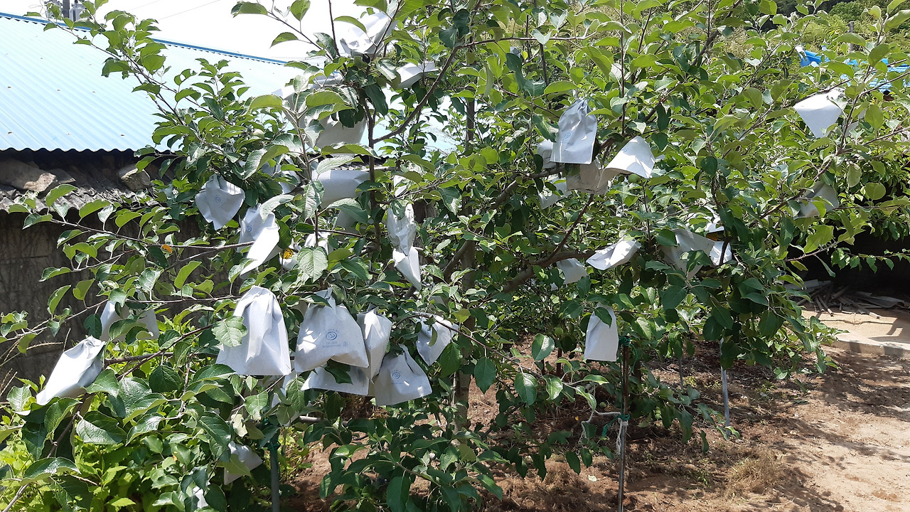 얼마 전에는 내가 가서 사과를 적과하고 봉지를 씌웠다. 매사 부지런하고 빈틈없는 남편에게도 구멍이 있었다. 예를 들면 봉지 씌우는 일 같은 것, 작은 열매에 봉지를 씌우는 일은 단순한 노동 같지만 사실 고난도의 예술 행위이다. 저도 살려고 가지에 딱 붙어있는 엄지손톱만한 열매에 조심스레 봉지를 씌우고 속을 넣은 만두피를 여미듯 봉지를 잘 여며 봉지 입구 한 쪽에 붙어있는 가느다란 철사로 마무리를 해야 한다. 조금만 힘을 주면 봉지가 찢어져 버리거나 열매가 떨어져버린다. 그 고난도 예술을 무식하게 투박한 남편의 손으로는 불가능한 일이었다. 해서 아직은 그런대로 유연하고 그럴싸한 내 손이 친히 출동을 한 것이었다.