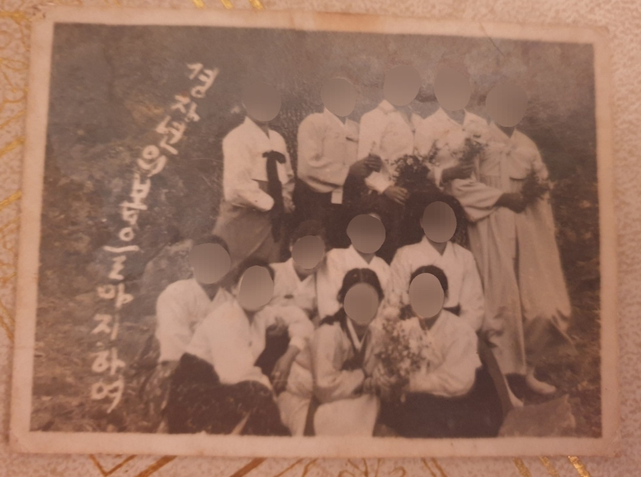 갓 스무 살이 됐을 사진 속 앳된 여인은 친구들과 꽃 봉우리가 피어나는 시간 속에서 영원으로 갇혀 있었습니다. 열 명 가까운 여인들은 둔덕에서 옹기종기 찍은 사진 속에는 지금 중년의 나보다 훨씬 젊은 여인이었습니다. 모두 하얀 저고리를 입고 짙은 색상의 치마를 단정히 입은 그녀들 중 유독 들꽃 한 다발을 들고서 미소 짓고 있습니다. 꽃잎을 든 채 꽃잎 같은 그녀가 흑백의 뒤안에서 환히 웃고 있습니다.