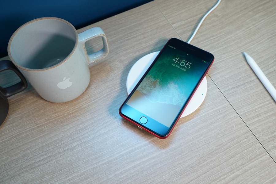 앞서 이 제품의 후면 레드 색상이 전작과 다른 느낌이며 그 이유는 글래스 소재 때문이라고 말씀드렸는데요. 후면에 글래스가 적용되어, 무선충전이 가능합니다. 저희 집에서는 벨킨 무선충전 패드를 사용하고 있는데요. 이렇게 올려두면 바로 충전이 가능합니다.