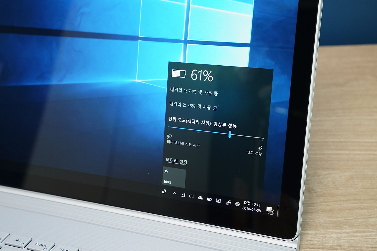 성능을 이야기할 때 빼 놓을 수 없는 것 중에 하나가 바로 배터리입니다. 서피스북2 공식 배터리 타임은 테스트 기준 17시간 동영상 감상 가능인데요. 제가 직접 사용해보는 동안 느낀 배터리는 물론 어떤 작업을 하느냐에 따라서 달리질 수 있지만 하루는 충분히 사용할 수 있다는 것이었습니다.