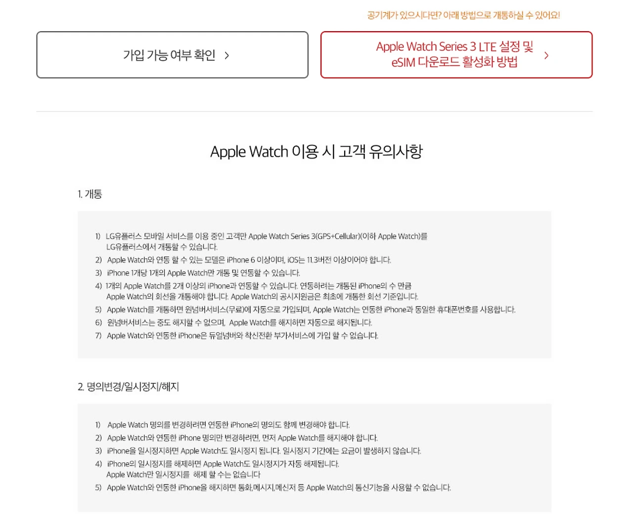 애플워치 시리즈3 셀룰러 모델의 개통은 온라인에서도 가능했습니다. 아래 링크를 통해서 애플워치 시리즈3 셀룰러 모델의 개통이 가능한 전 세계 통신사를 확인할 수 있으며, 여기서 본인이 이용하는 국내 통신사(SKT / LG 유플러스)를 선택하면 가입 가능 여부 확인과 LTE 설정, eSIM 다운로드 활성화 방법 등에 대한 안내를 확인할 수 있습니다. 애플워치 시리즈3 셀룰러 모델은 아이폰과 다른 번호를 사용하는 것이 아니라 같은 번호를 사용하게 되는 것이기 때문에 기존에 사용하고 계시는 아이폰 통신사에서 개통할 수 있습니다.