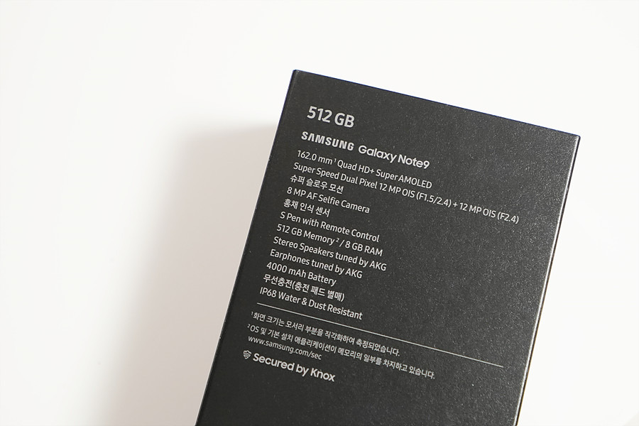 패키지 후면에서는 스펙을 확인할 수 있는데요. 국내 출시 제품은 엑시노스 9810 AP, 스페셜 에디션 모델은 RAM 8GB, 저장공간 512GB를 탑재하고 있습니다. 기타 스펙은 일반 모델과 동일하며, 1200만 화소 (F1.5/2.4) 듀얼 카메라, 800만 화소 전면 카메라, AKG 튜닝 스테레오 스피커, 4,000mAh 배터리입니다.