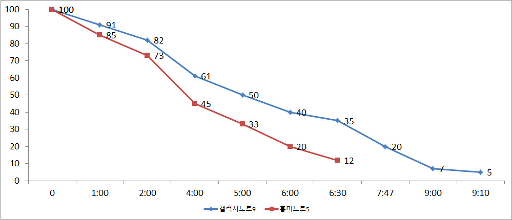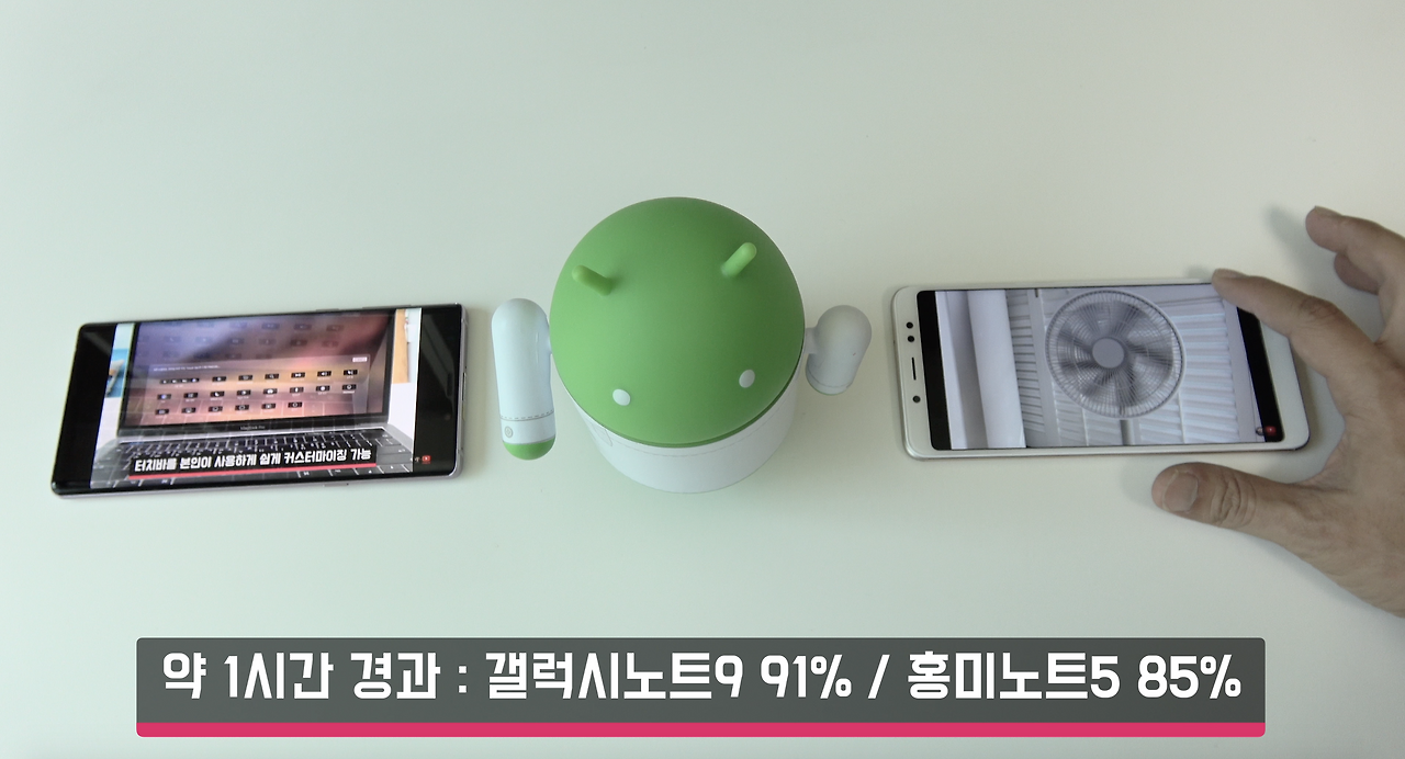 약 한 시간의 시간이 경과했을 때 모습입니다. 갤럭시노트9 모델은 91%의 배터리 잔량을 홍미노트5 모델은 85%의 배터리 잔량을 보였습니다. 갤럭시노트9은 이후 꾸준히 한 시간에 약 10%의 배터리가 소진되는 것을 볼 수 있었습니다.