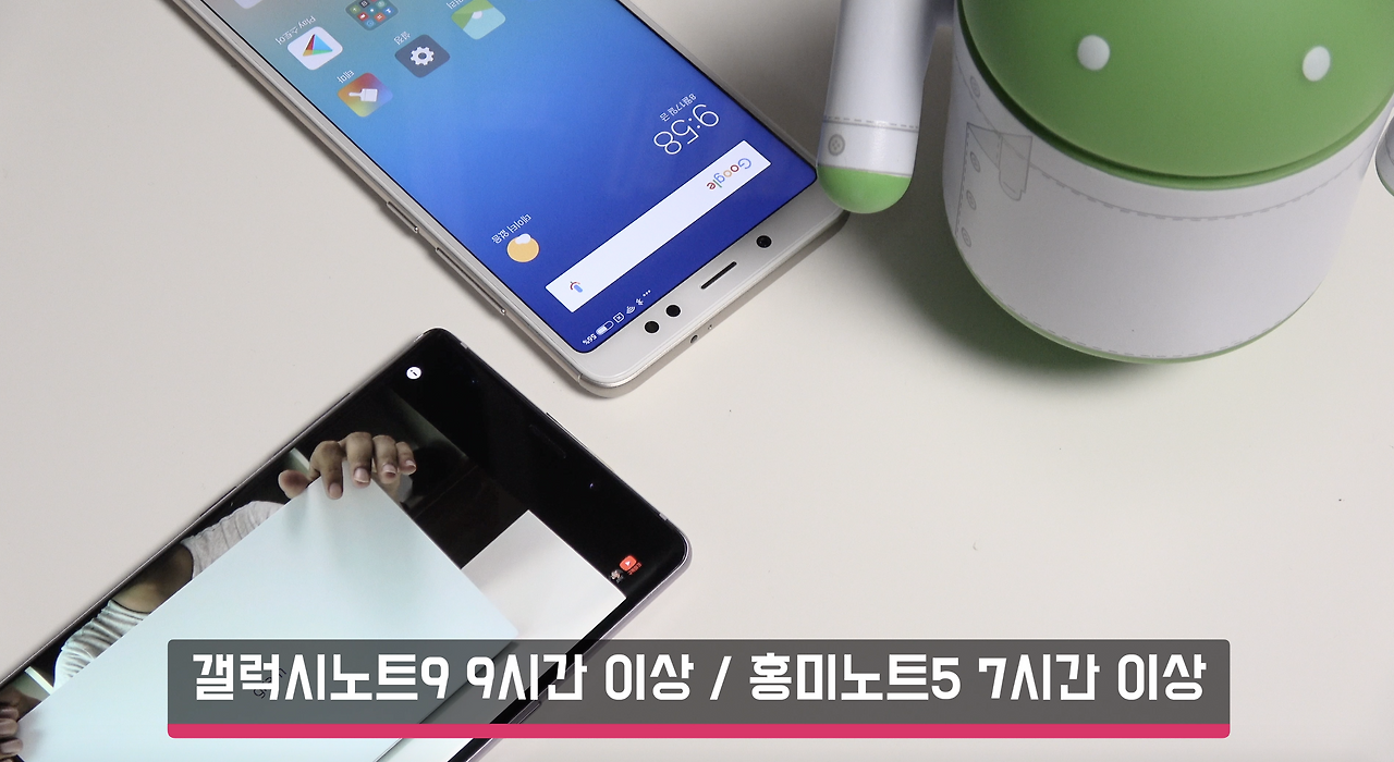 5% 이하가 되면서 절전 모드가 실행되고 자동으로 밝기가 조절되었기 때문에 배터리 테스트를 마쳤습니다. 그 결과는 갤럭시노트9 모델의 경우 9시간 이상 동영상 스트리밍이 가능했고, 홍미노트5 모델은 7시간 이상 가능한 것을 알 수 있었습니다. 참고로 얼마 전에 테스트를 했던 4500mAh 배터리를 탑재한 LG X5 모델이 노트9과 유사한 결과를 보였습니다.