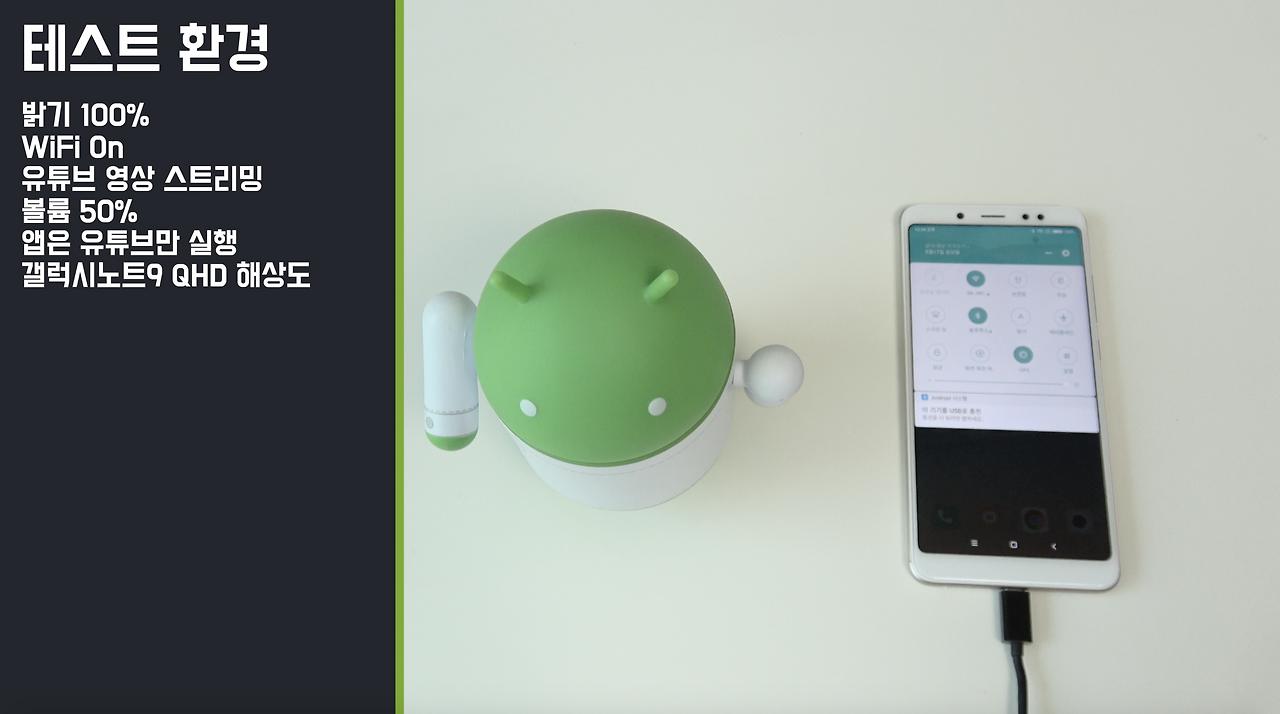 테스트 조건은 제가 진행하고 있는 배터리 테스트 조건과 동일하게 설정했습니다. 배터리 100% 상태에서 밝기 100%, WiFi On 상태로 유튜브 동영상을 스트리밍하는 것으로 테스트를 했습니다. 앱은 유튜브만 실행했고, 볼륨 50%로 설정했습니다.