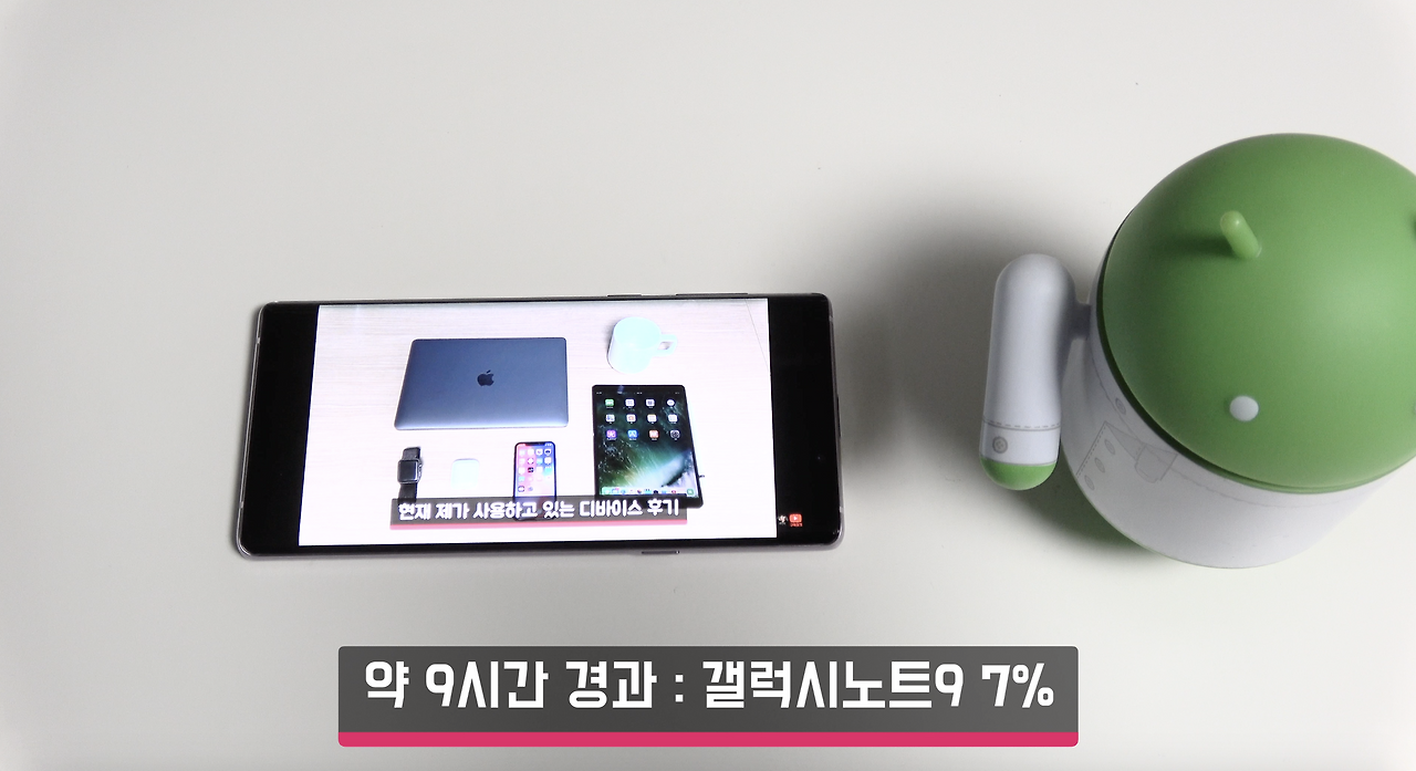 약 7시간이 경과한 후에는 갤럭시노트9 모델의 배터리 잔량을 7%입니다. 보통 스마트폰 배터리 테스트를 하면 50% 이후가 되면 100%에서 50%까지와 다르게 빠르게 배터리가 소진되는 경향을 보이는데요. 이 모델은 기대했던 것보다 안정적으로 배터리를 사용하더군요.