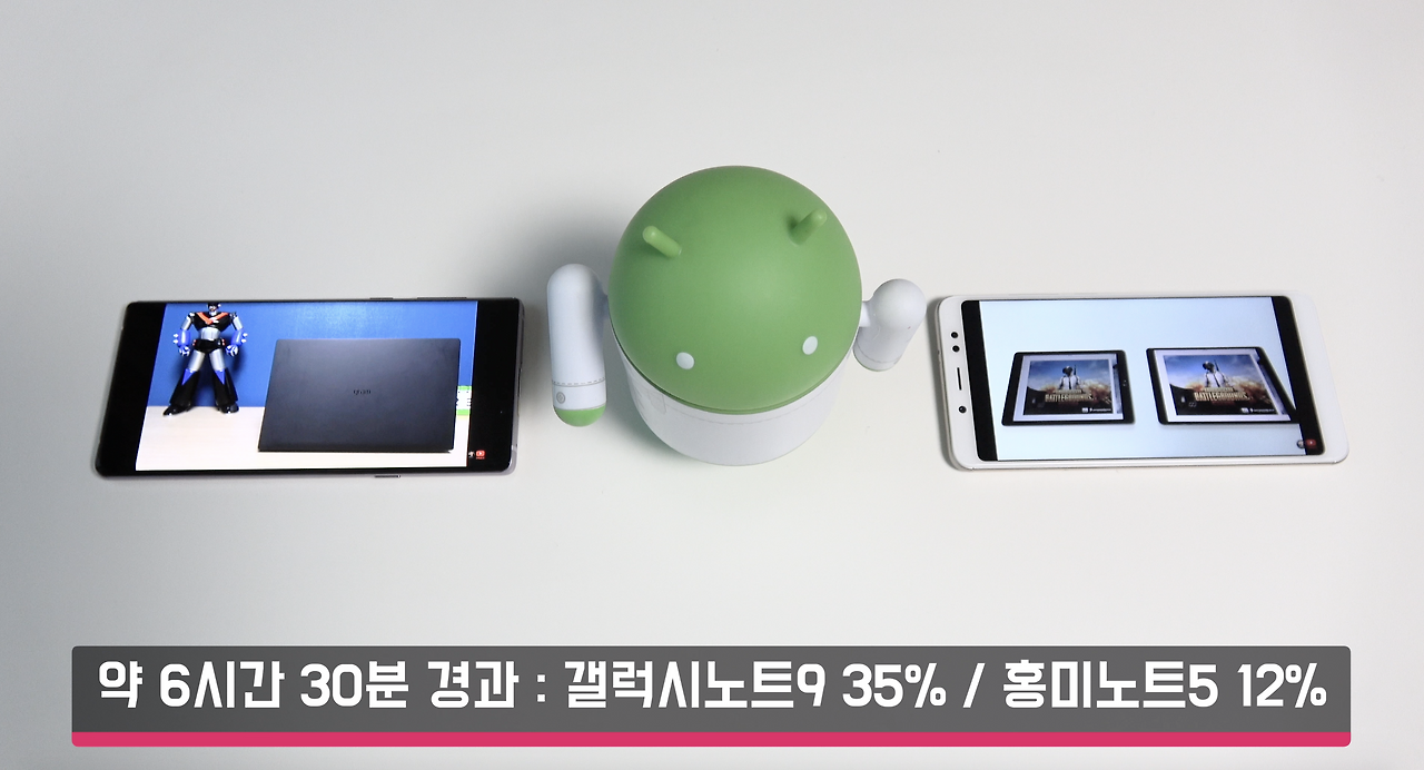 약 6시간 30분 경과 후 갤럭시노트9 모델은 35% 배터리 잔량을 홍미노트5 모델은 12% 배터리 잔량을 보였습니다. 홍미노트5 모델 역시 4,000mAh 배터리를 탑재해 7시간 이상 동영상 스트리밍 플레이가 가능한 것을 확인할 수 있었습니다.