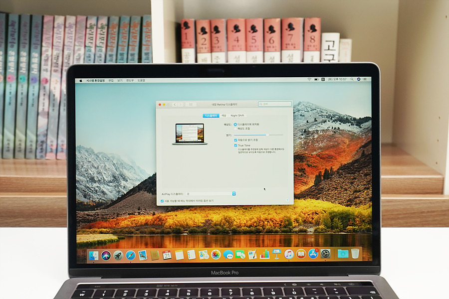 신형 맥북프로 2018 모델은 전작과 마찬가지로 500니트의 밝은 디스플레이를 탑재되어 있기 때문에 밝은 곳에서도 문제없이 사용할 수 있고, P3 색영역을 지원하여 사진 등을 선명하게 감상할 수 있습니다. 달라진 부분은 바로 True Tone 디스플레이가 탑재되었다는 점입니다. True Tone 디스플레이는 아이폰 등에 탑재되어 있는 기능으로 사용하는 공간의 색온도에 따라서 디스플레이를 맞춰주는 기능입니다. 이 기능은 환경설정에서 on / off 할 수 있습니다.