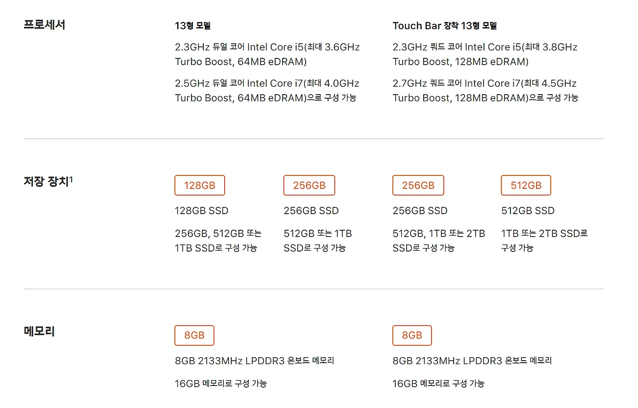 쿼드코어 i5 프로세서에 RAM 8GB, 저장공간 256 or 512GB이 기본 모델이지만, 선택 옵션으로 인텔 i7 프로세서, RAM 16GB, 저장공간 2TB로 구성하실 수도 있습니다. 저처럼 동영상 편집을 하시는 분들은 저장공간은 조금 높여보시는 것도 좋을 것 같습니다. 저장장치는 순차 읽기 속도가 최대 3.2GB/s의 SSD이며, 13인치 모델은 용량이 2배 증가한 128MB 내장 DRAM이 장착되어 그래픽 처리 속도 또한 증가했습니다.