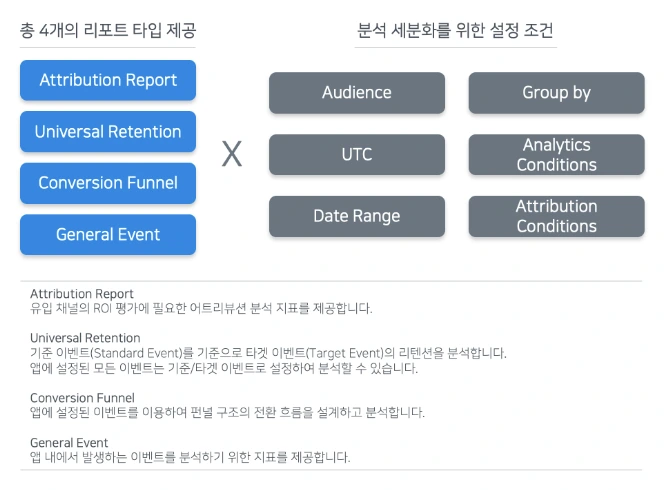 어트리뷰션 툴은 앱 설치, 특정 페이지로의 전환, 다운로드, 구매 등 마케팅의 성과(결과)로 설정할 요소가 다양한 모바일 앱 마케팅 분야에서 매우 중요한 툴 중 하나입니다. 특히, 어트리뷰션 툴을 사용하면, 회원가입, 구매 등의 인앱 이벤트가 발생하기 이전에 유저가 광고를 보고 클릭해 앱스토어에서 앱을 설치하는 단계까지 광고 식별 값을 따라 모두 트래킹할 수 있기 때문에, 원하는 이벤트로 이어진 광고를 특정해낼 수 있으니 중요함을 넘어서 필수 요건이라고 할 수 있습니다.