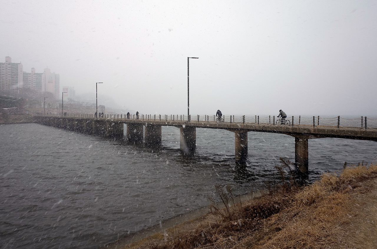지난 일요일, 한강 합수부에 가까워지는 데 하늘에 먹구름이 끼기 시작하더니 간간히 눈발이 날리기 시작했다. 겨울이라 얼마든지 있을 수 있는 상황이라 개의치 않고 계속 걸었다. 그런데 합수부에 이르자 갑자기 폭설로 변했다. 거기에 강풍까지 부니 안경에 눈발이 부딪쳐 시야를 가릴 지경이었다. 그런데 희미한 시야 앞에 벼락같은 장면이 나타나지 않는가! dslr이 아니라 아쉬움이 있었지만 28mm로도 충분히 멋진 장면을 담을 수 있었다. 집에서 나올 땐 전혀 기대하지 않은 사진의 즐거움을 만끽하는 순간이다. 이래서 산책 나갈 때는 작은 똑딱이라도 꼭 챙긴다. [2022.02.19]