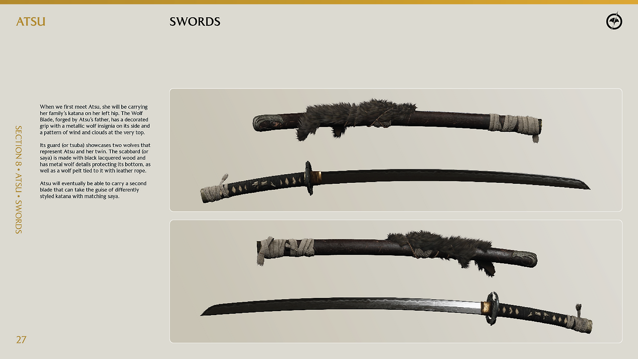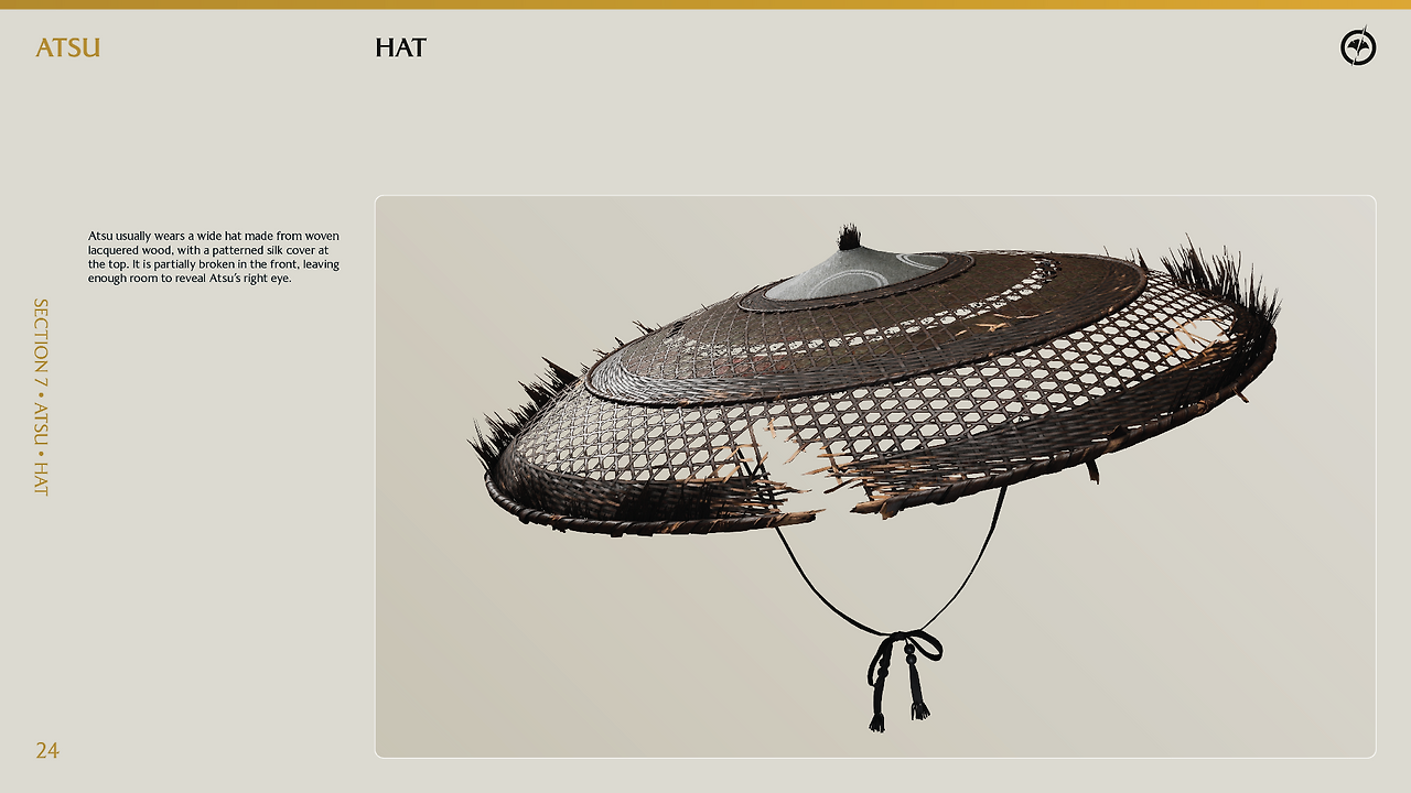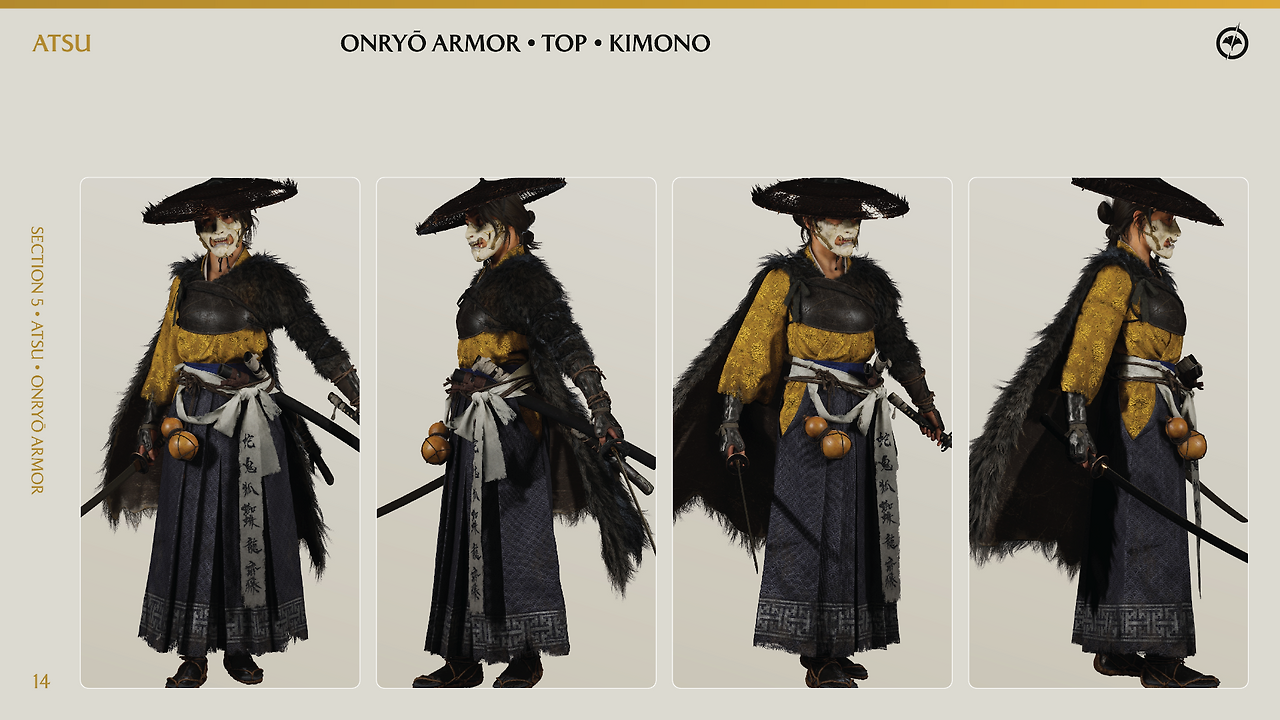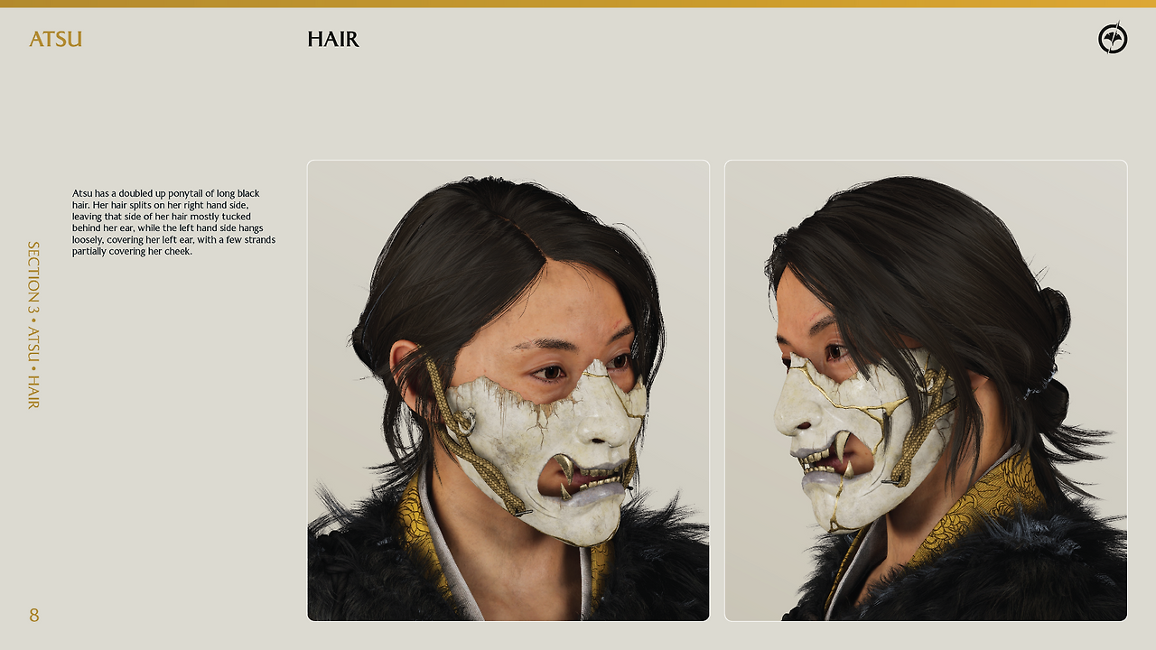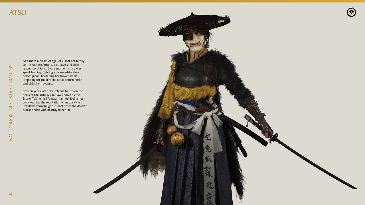 고스트 오브 요테이의 재미있는 점은 코스프레 가이드라인을 제공한다는 점이다. 출시 전후로 팬들이 요테이의 주인공 '아츠'에게 더 깊이 몰입하고 애정을 표현할 수 있도록 제작사에서 공식적으로 배포한 창작자 지원용 설정집 내용인데 아주 디테일하다.