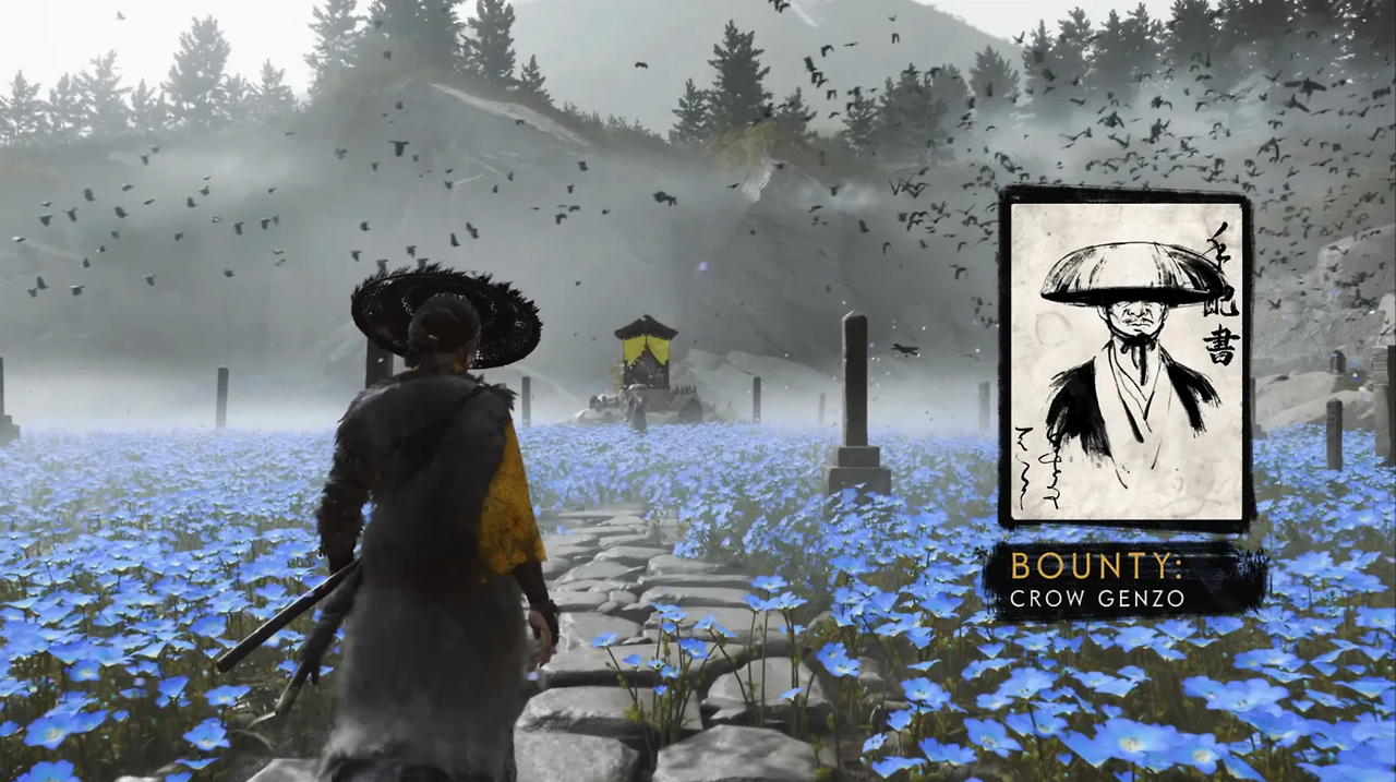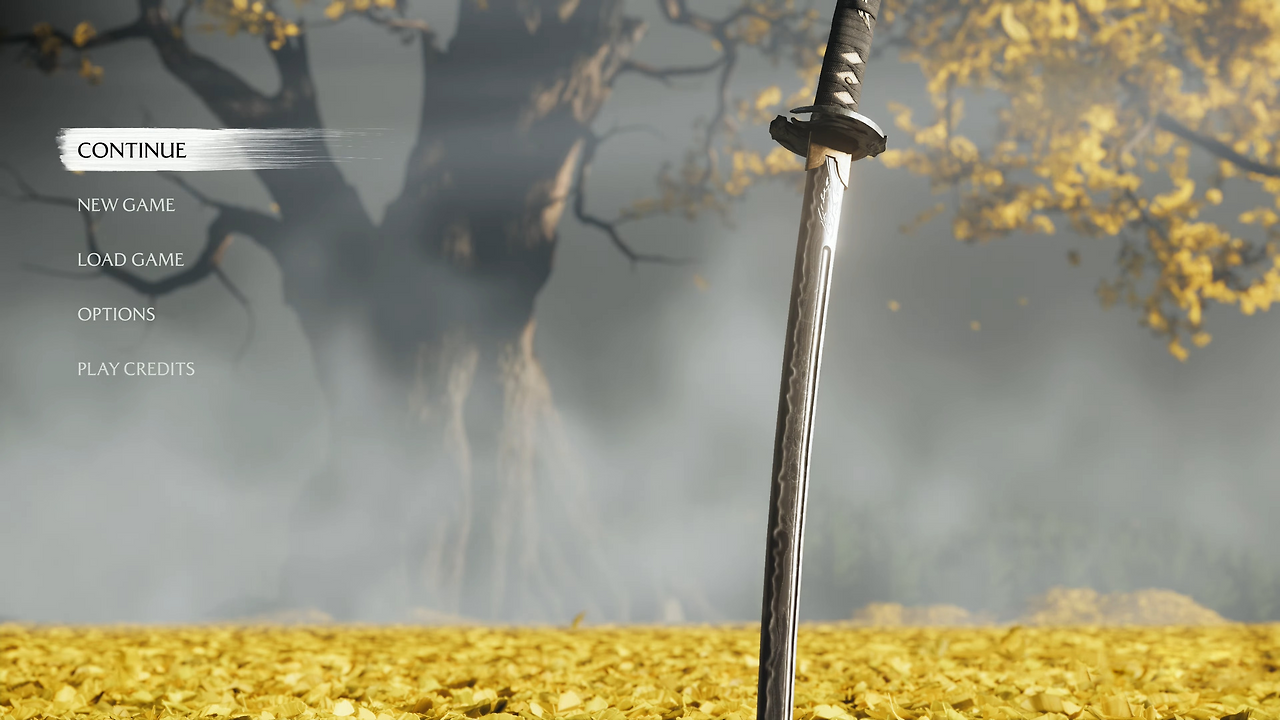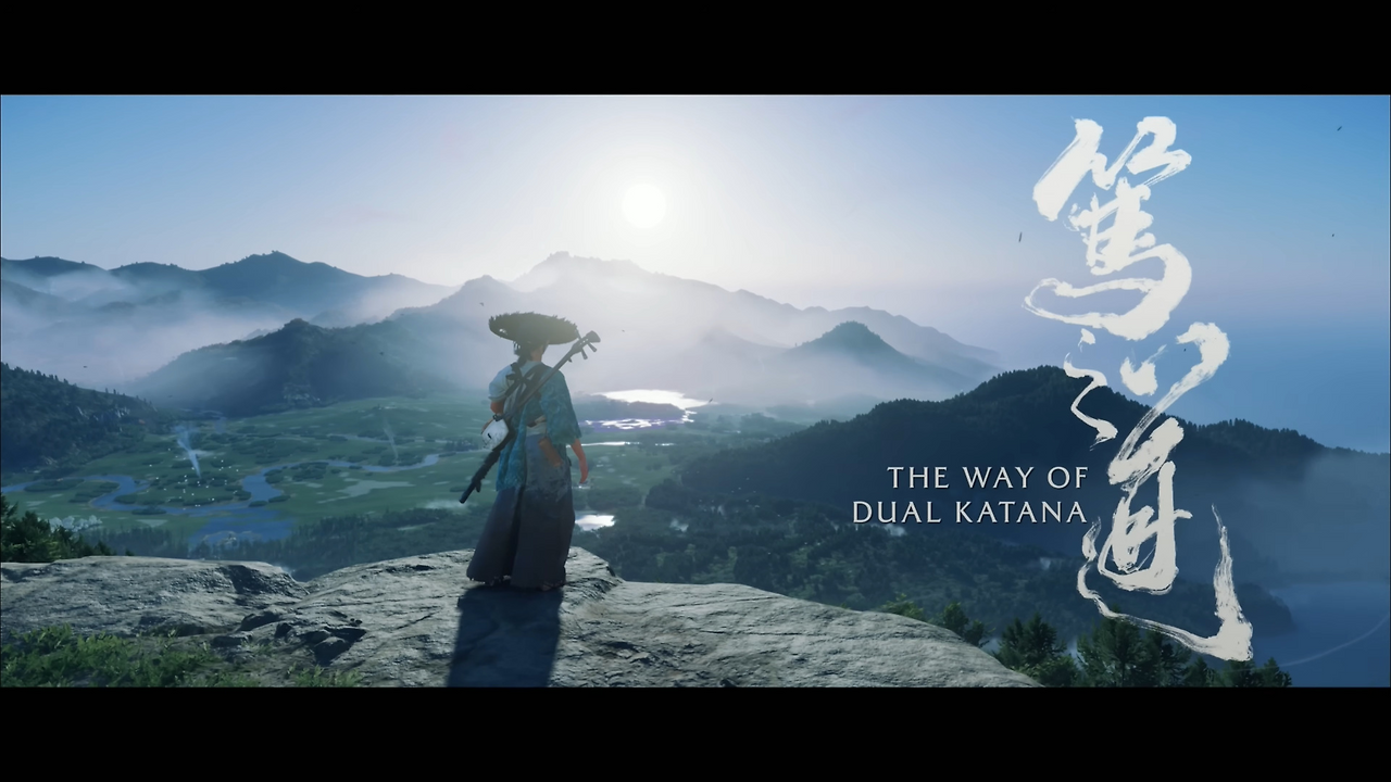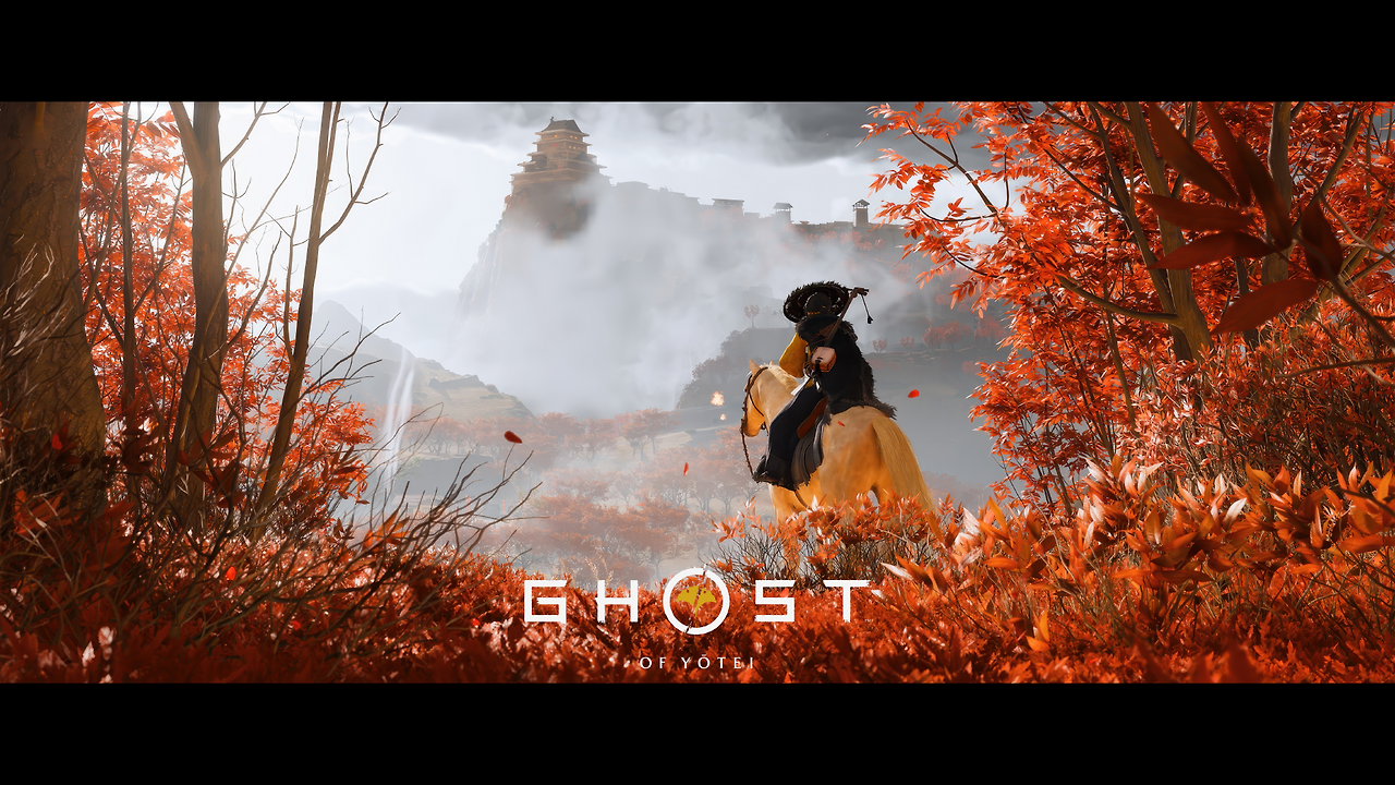 고스트 오브 요테이: 눈 덮인 산과 흩날리는 은행잎을 통해 새로운 시간대와 새로운 지역의 계절감을 확립했다. 땅에 꽂힌 여러 자루의 검은 주인공이 걸어갈 피비린내 나는 복수의 길과 외로운 여정을 암시한다.