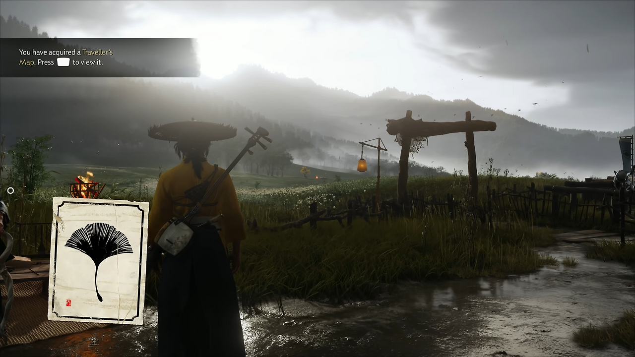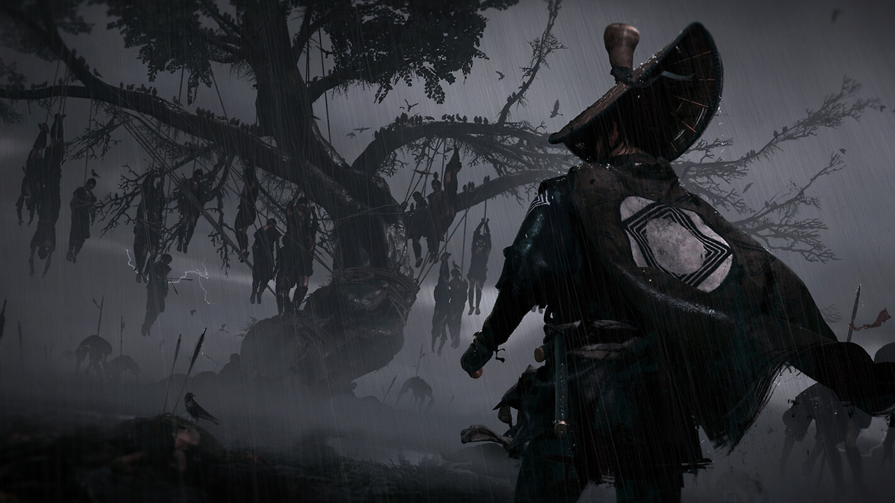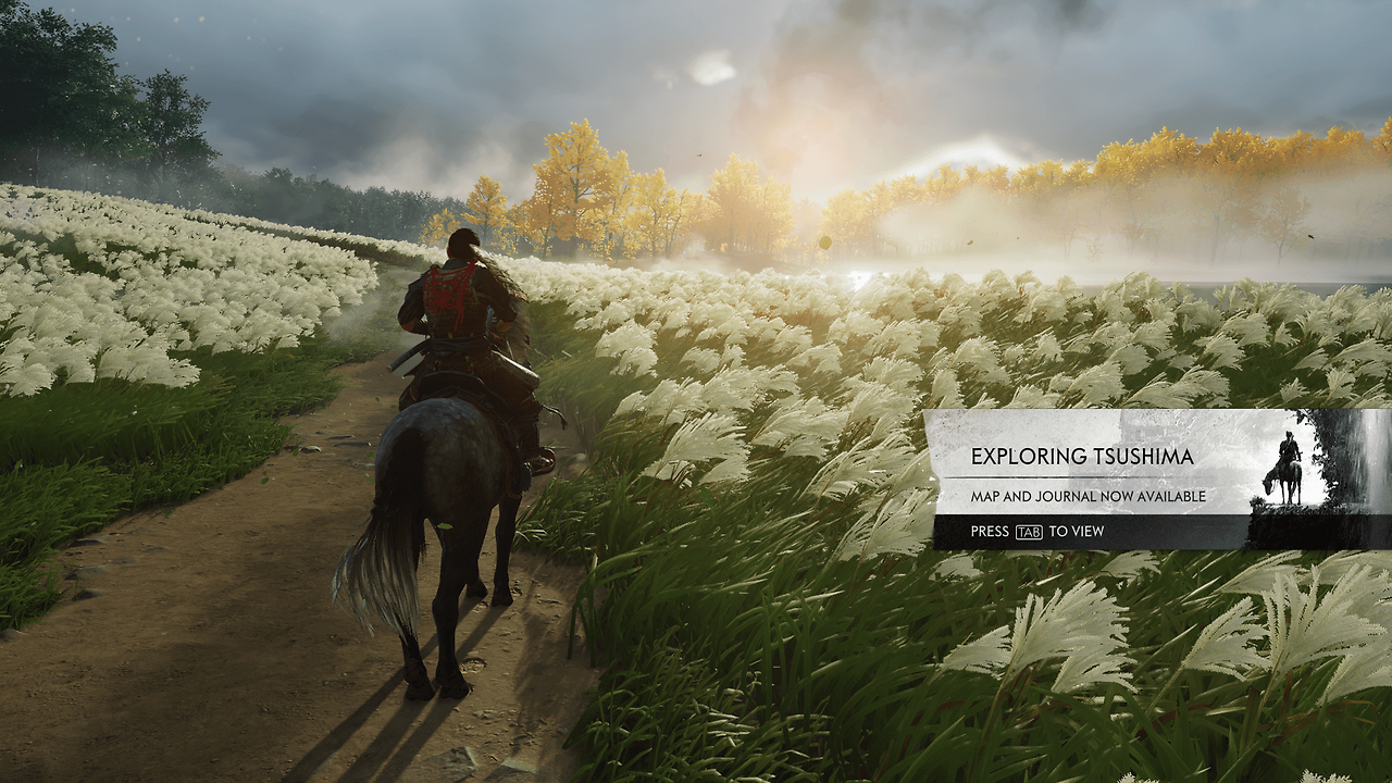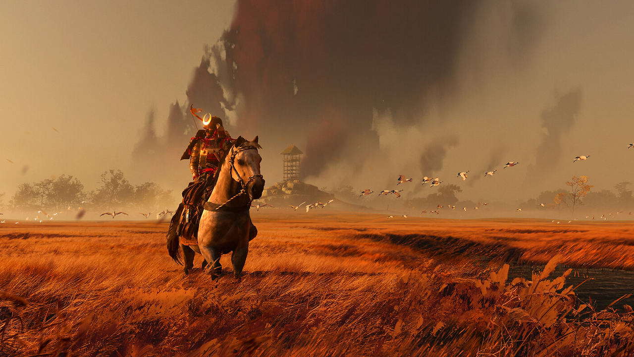 고스트 오브 요테이: 눈 덮인 산과 흩날리는 은행잎을 통해 새로운 시간대와 새로운 지역의 계절감을 확립했다. 땅에 꽂힌 여러 자루의 검은 주인공이 걸어갈 피비린내 나는 복수의 길과 외로운 여정을 암시한다.