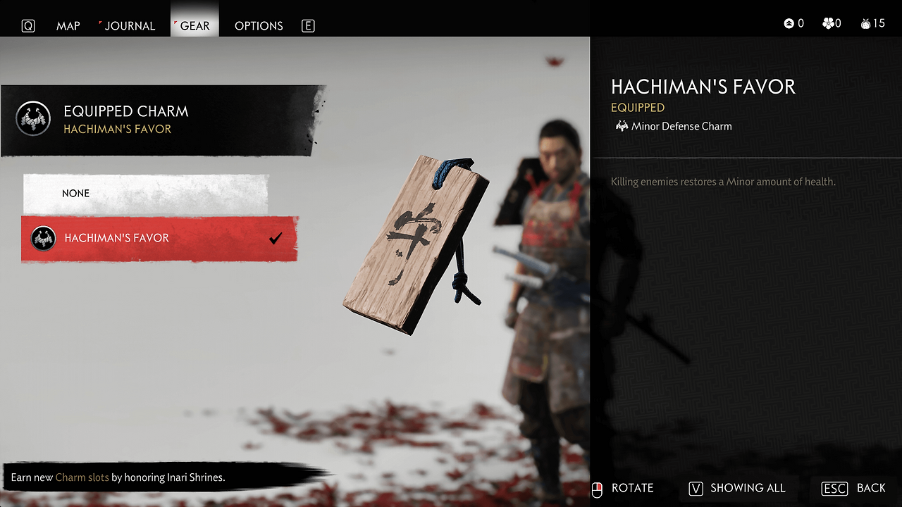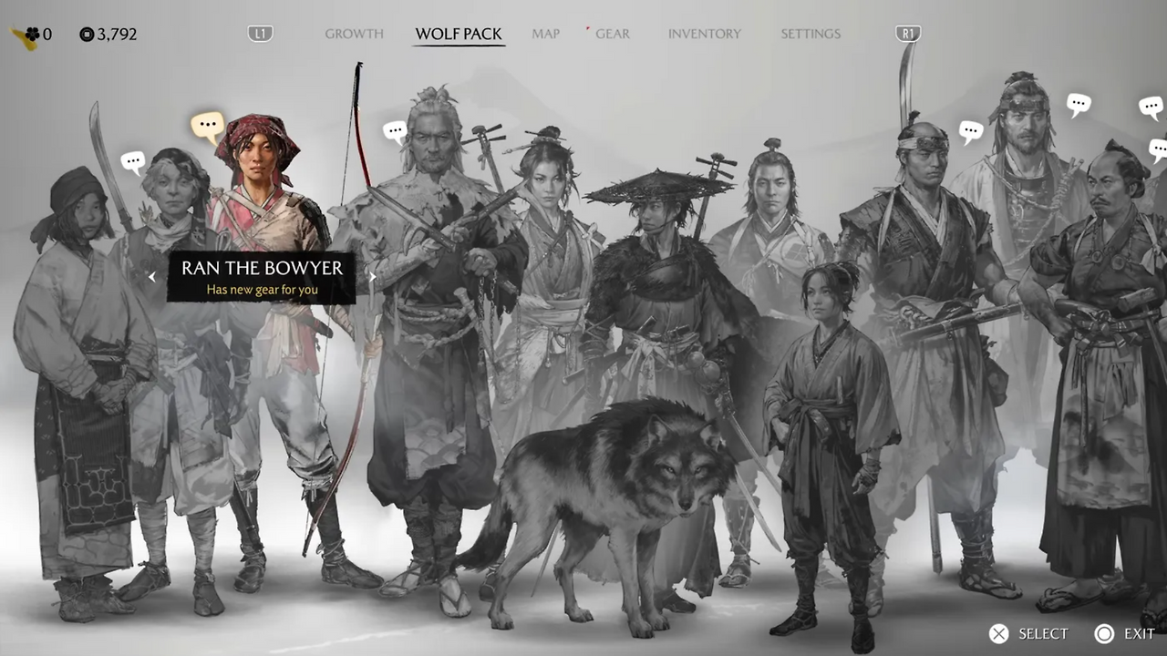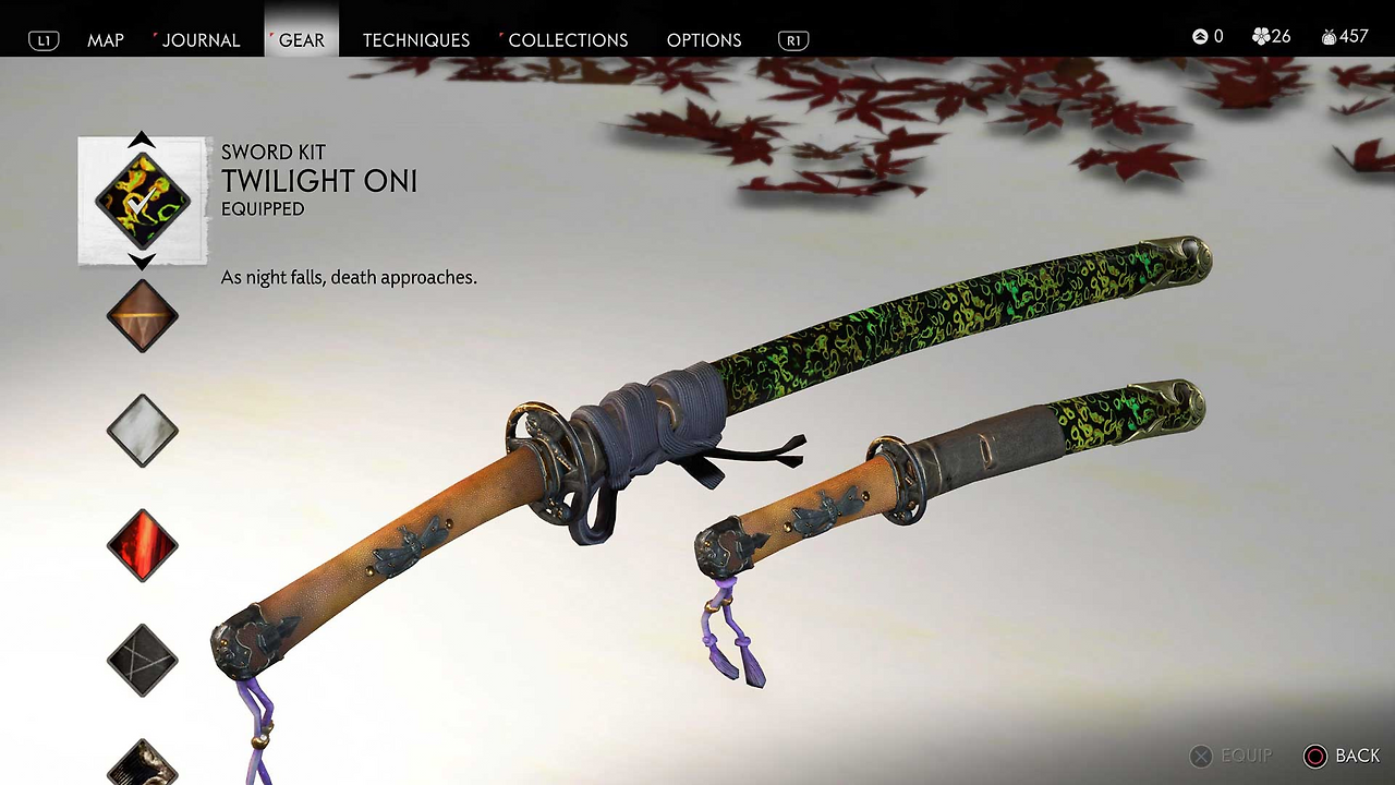 고스트 오브 요테이에선 사용할 수 있는 장비가 많아지다 보니, 장비 창에 띄워진 아이콘도 꽤 많아졌다. 전작의 깔끔한 디자인 톤은 그대로 가져왔지만, 오직 아이콘으로만 빽빽하게 채워진 화면이 다소 복잡하고 산만해 보여서 개인적으로는 조금 아쉽게 느껴진다.