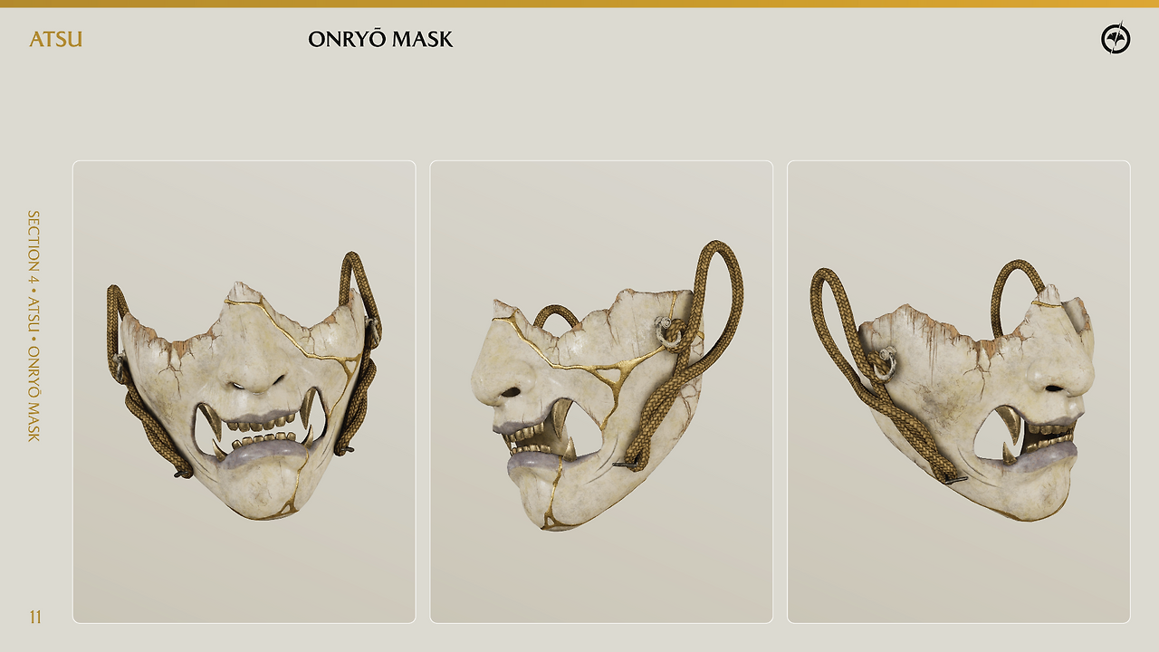 이는 로고 디자인에서부터 명확히 드러난다. 브랜드의 코어인 ‘GHOST’ 워드마크와 특유의 서예풍 미학을 유지해 팬들의 기억 자산은 확고히 했다. 동시에 밀도 높은 구성으로 역사적 중량감을 주었던 '쓰시마'에서, 간결한 리듬과 상징성을 지닌 '요테이'로 지명을 교체해 공간의 확장과 감정선의 전환을 암시했다. 이러한 정서적 배경 이동은 아트워크와 테마 전반으로 이어진다. 규율에 얽매인 사무라이를 상징하던 붉은 피의 사카이 가문의 문양은, 거친 무법지대를 떠도는 낭인의 황금빛 은행잎으로 변경됐다. 특히 부서진 반면구를 금으로 수리한 '킨츠기(Kintsugi)' 기법은, 과거의 비극으로 산산조각 난 내면을 딛고 치명적인 복수귀 '원령(Onryō)'으로 거듭난 새로운 주인공 '아츠'의 서사를 시각적으로 완벽하게 대변한다.