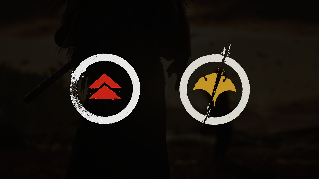 좌측 쓰시마 심볼은 기하학적이고 대칭적인데, 이는 사무라이의 규율, 질서를 상징한다. 우측 요테이 심볼은 파괴된 원(칼자국)으로 떠돌이 낭인, 홋카이도의 길들여지지 않은 자연, 기존 질서의 붕괴를 내포한다. 시리즈가 '규율에 얽매인 귀족 무사'에서 '거친 야생을 떠도는 낭인/무법자'로 테마가 완전히 전환되었음을 심볼 안에 담아냈다.
