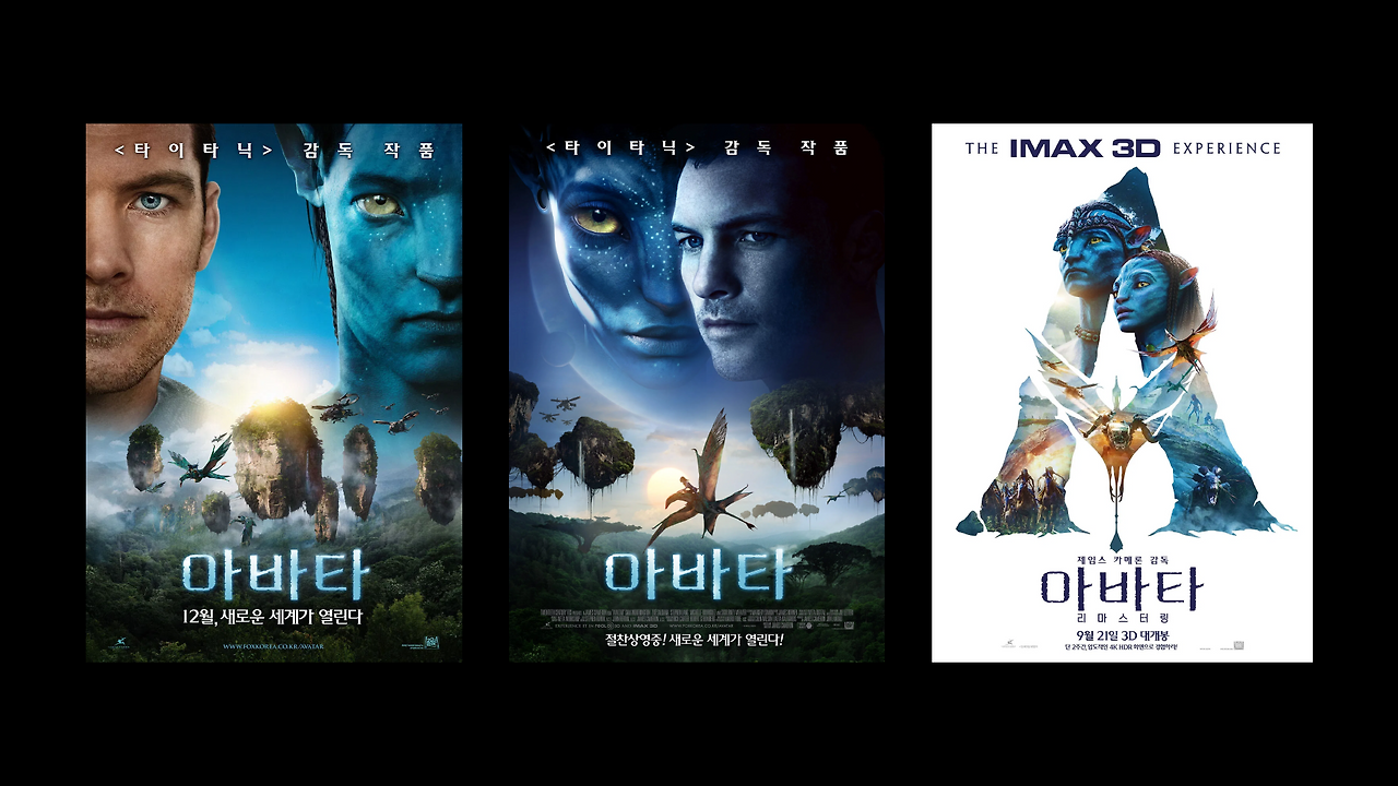 좌측 2장은 2009 개봉 당시 전형적인 인물 중심의 할리우드 포스터 문법을 따른다. 반면 우측의 2022 리마스터링 재개봉 포스터는 완전히 다른 접근을 보여준다. 거대한 A 엠블럼을 프레임으로, 그 안에 판도라의 세계를 담아냈다. 이는 10년이 넘는 시간 동안 아바타의 A 심볼이 대중에게 얼마나 강력한 아이콘으로 자리 잡았는지 증명한다. 구구절절한 배경 설명 없이 A 실루엣 하나만으로 이 영화가 무엇인지 설명하는 자신감도 느껴진다.