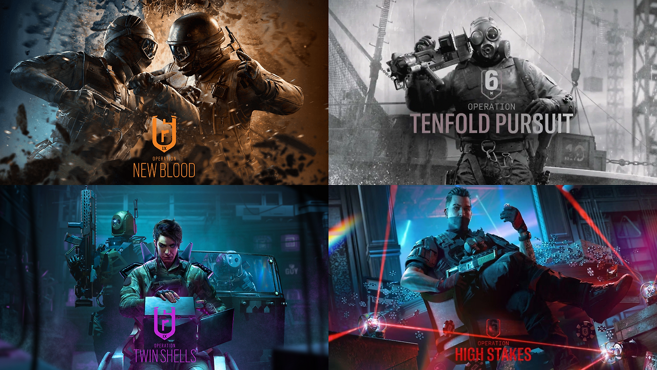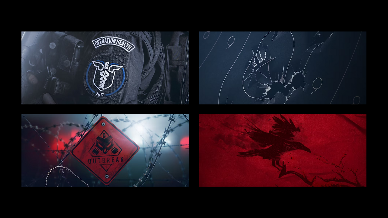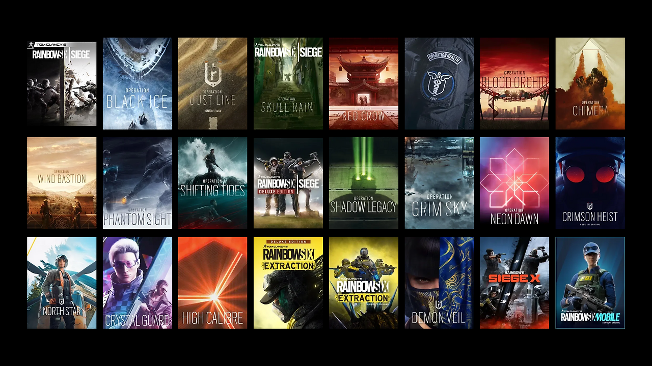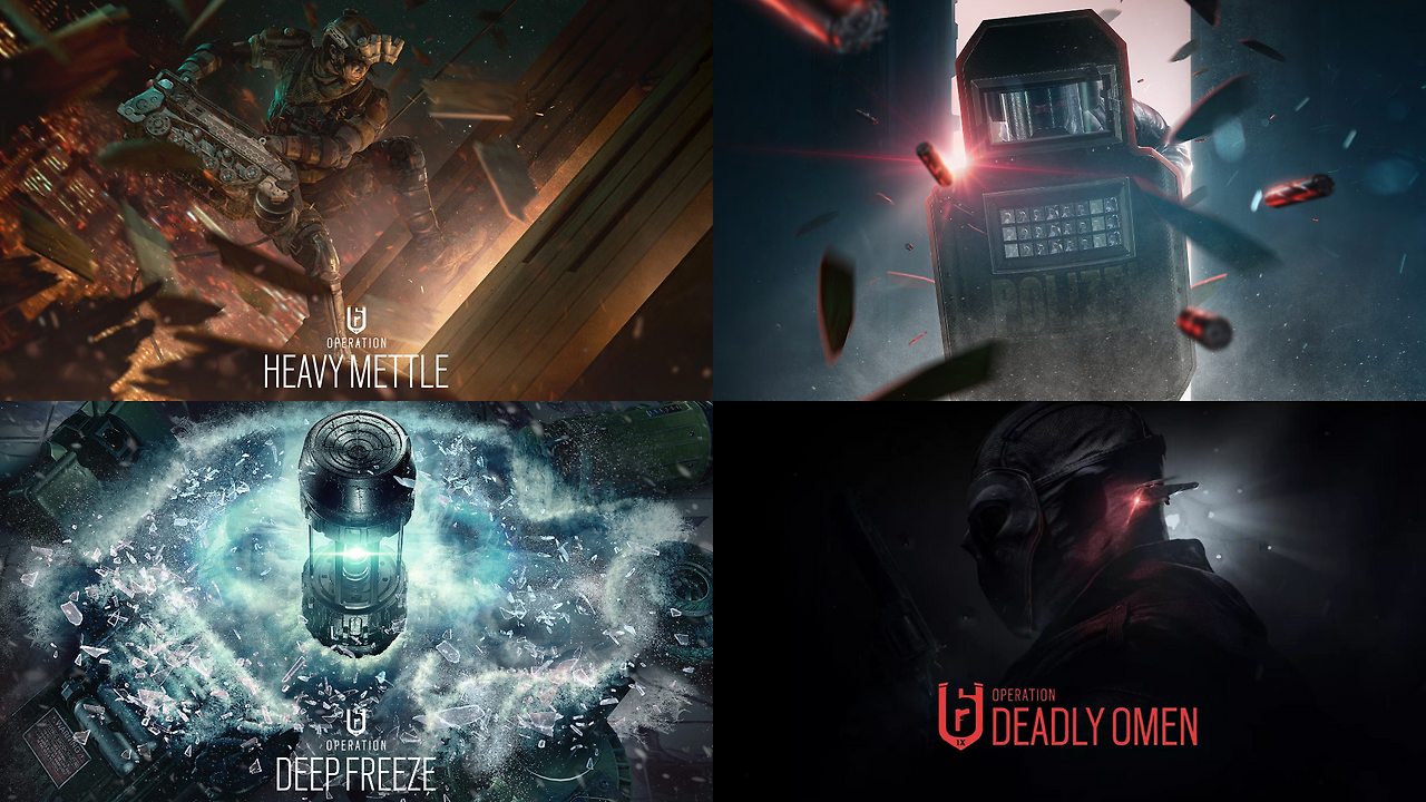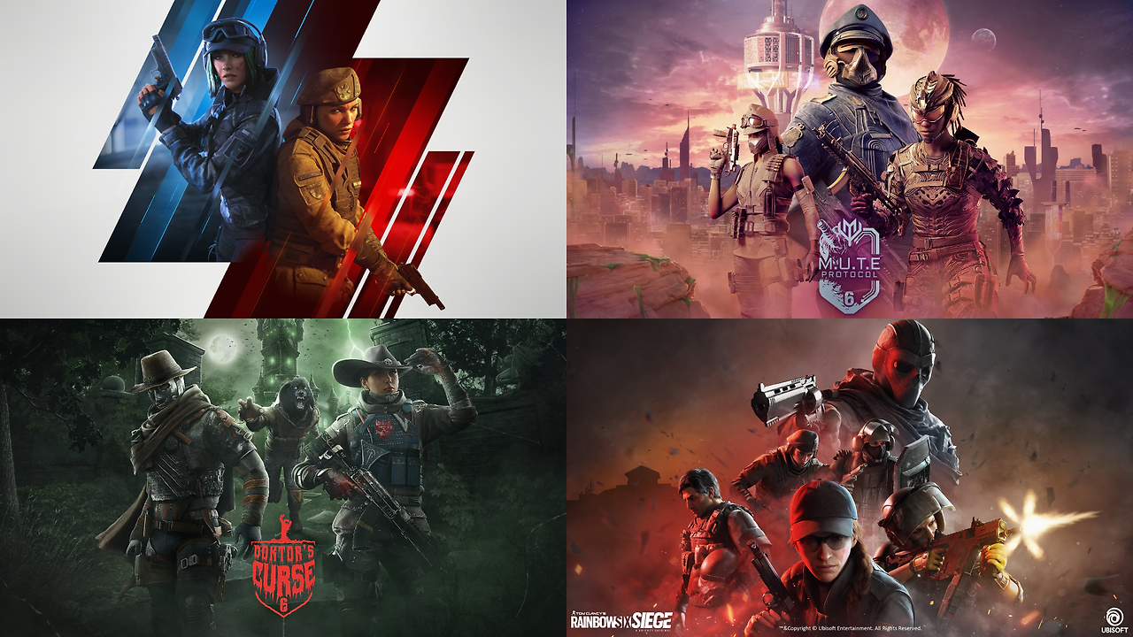초창기엔 어두운 배경에서 총을 겨누는 전형적인 밀리터리 장르의 클리셰로 표현된다. 우측 이미지의 좌상단 <시즈>가 시즌제 라이브 서비스로 전환하면서 표현력의 한계가 해방되는데, 점차 인물 중심에서 색감과 상징적 오브제만으로 시즌 별 분위기를 전달하는 Rainbow Six만의 세련된 문법을 찾아간다.