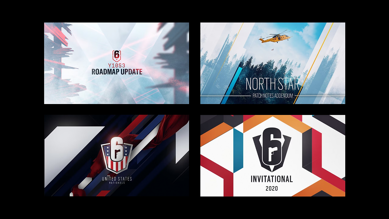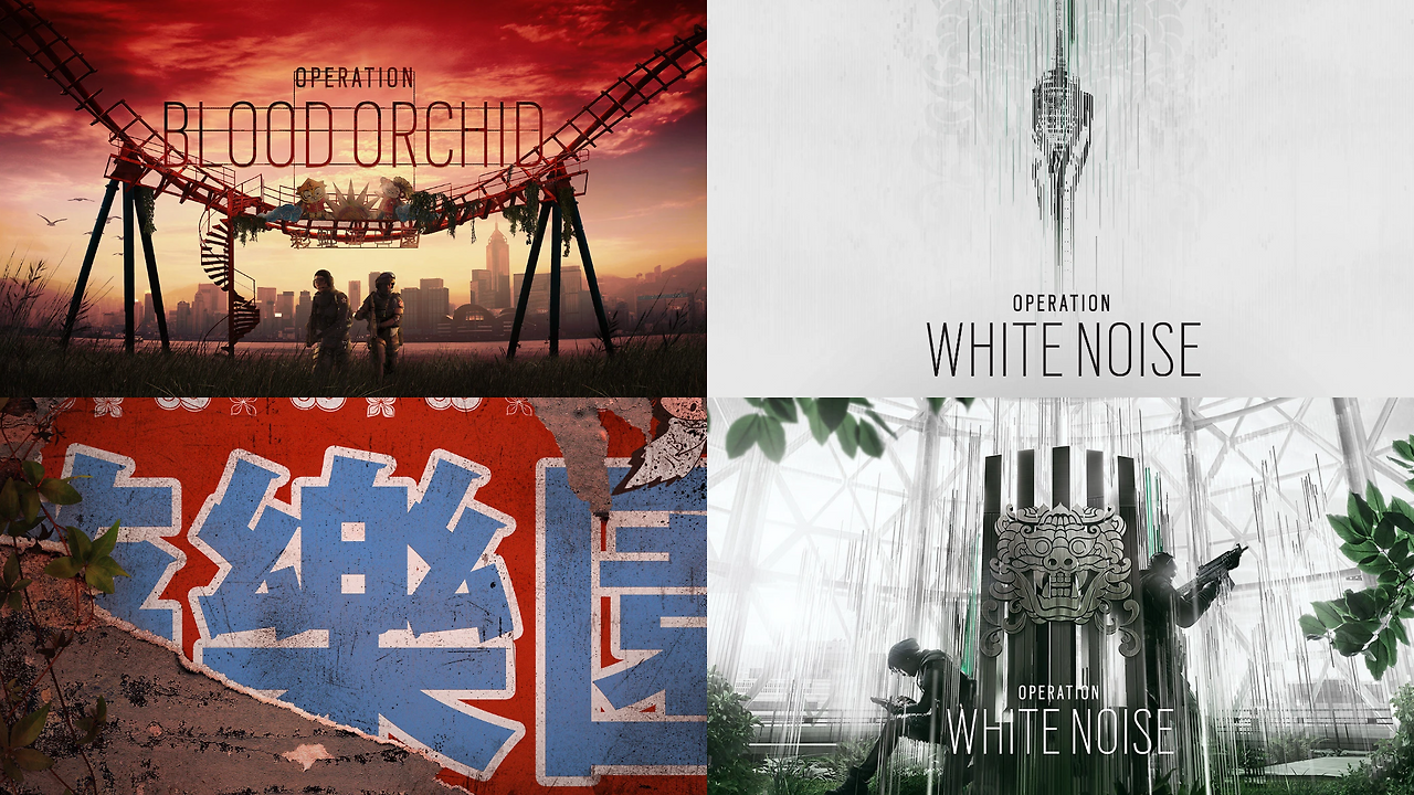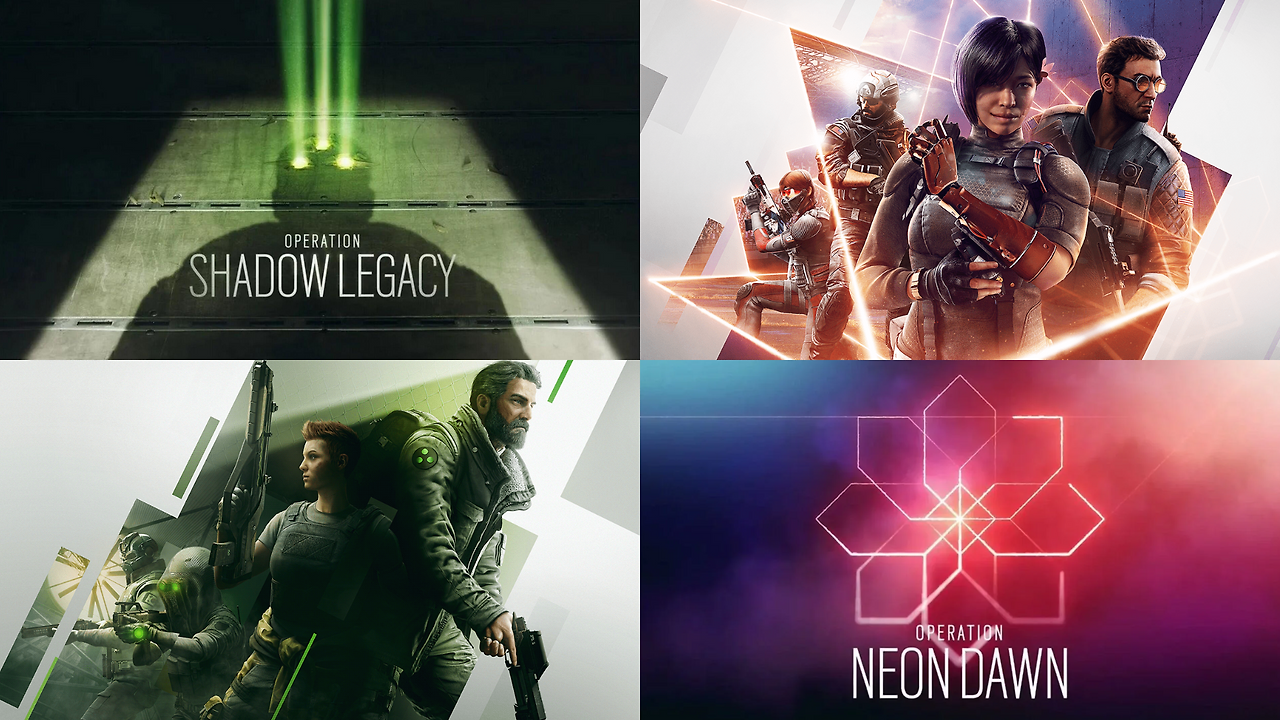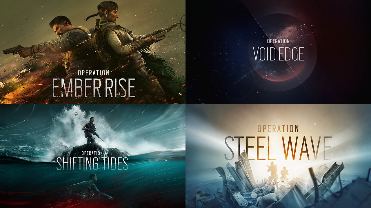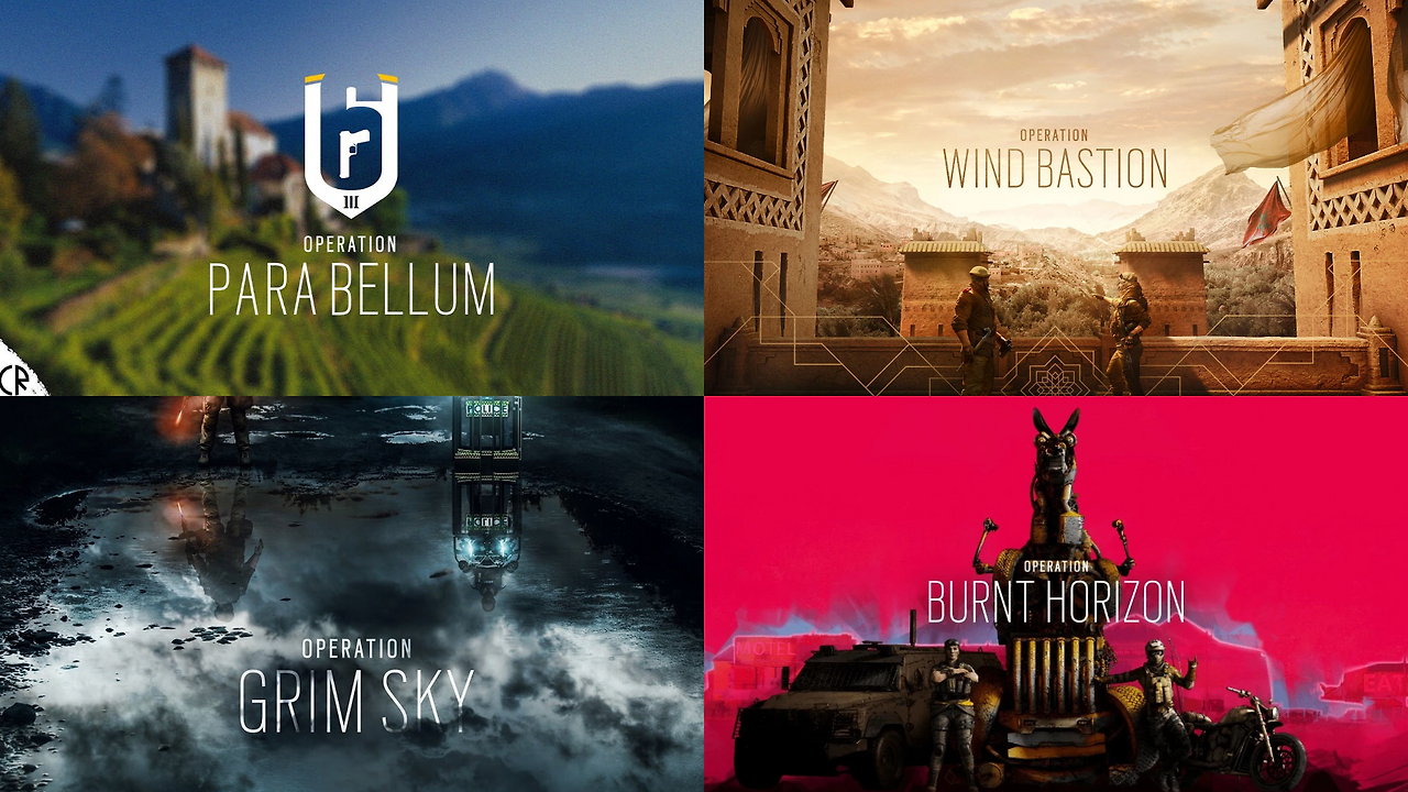 초창기엔 어두운 배경에서 총을 겨누는 전형적인 밀리터리 장르의 클리셰로 표현된다. 우측 이미지의 좌상단 <시즈>가 시즌제 라이브 서비스로 전환하면서 표현력의 한계가 해방되는데, 점차 인물 중심에서 색감과 상징적 오브제만으로 시즌 별 분위기를 전달하는 Rainbow Six만의 세련된 문법을 찾아간다.